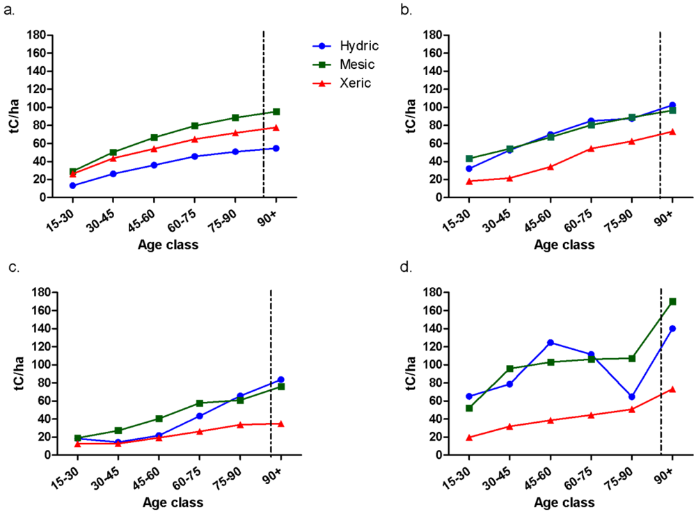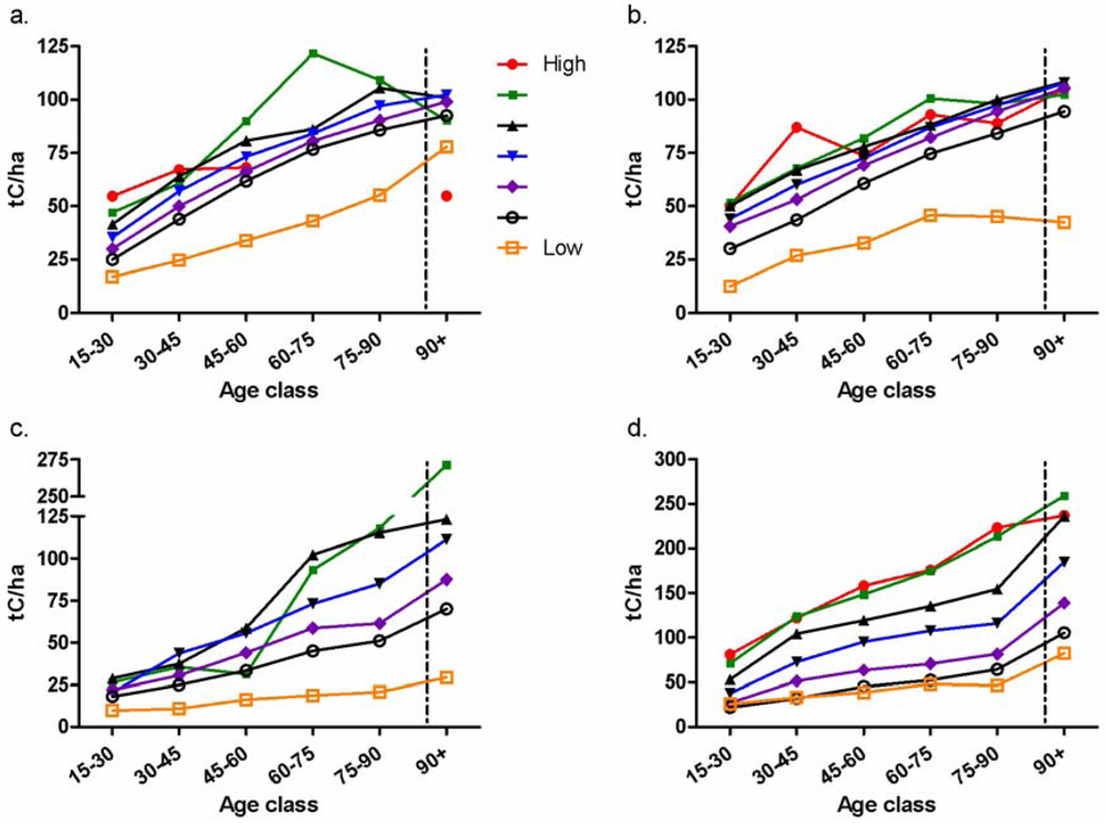 A common theme to the trends as illustrated in Figure 2 and Figure 3 is that relative differences in mean carbon density among classifications were generally less in the East relative to the West. In addition, the differences among average values in the West tended to increase with stand age class. Differences in carbon associated with indicators of productivity were established early; this is apparent in that the relative rate of carbon increase over the first age class interval exceeded the mean rate for the next three intervals in 31 out of the 38 trends in the charts of Figure 2 and Figure 3.