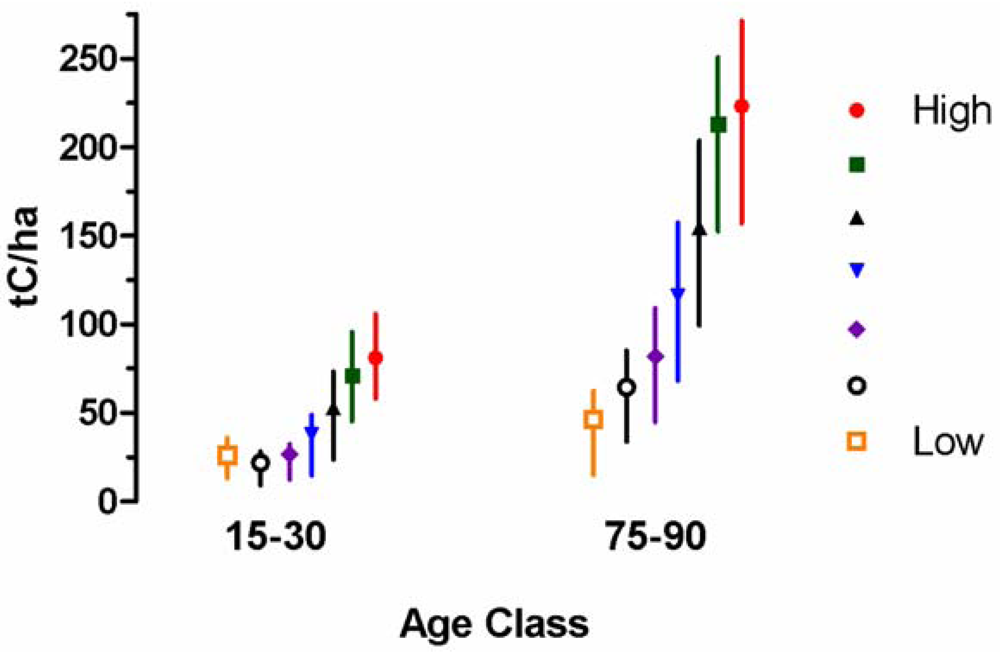 The focus of the above results has been on regionally expected values based on site quality indicators and stand age. However, a carbon sequestration project is necessarily site specific, and stand to stand heterogeneity is such that a wide range of carbon densities contribute to these average values. Figure 4 illustrates the distribution of plot level values corresponding to the means for the Pacific Coast region from Figure 3. The vertical bars represent the range between the 25th and 75th percentiles of the plot level densities for each productivity class for two age classes, 15–30 years and 75–90 years. At age 75, the mid fifty percentile of plots are clearly different for the highest versus lowest productivity sites, but overall variability is high relative to differences among the means. A test for significance is not called for in this case because we are interested in illustrating the heterogeneous yet continuous trend among plots. Again, the particular values are not so important here. These ranges are typical for the trends illustrated in Figure 2 and Figure 3 and indicate that while indicators of productivity are positively associated with levels of carbon density it is likely that more site-specific factors control actual carbon sequestration achieved per stand.
