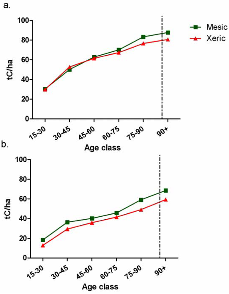 Aboveground live tree carbon density (t/ha) by age class and physiographic class for xeric and mesic plots in selected forest types and states. Note that the 90+ year age class includes a range of age classes and may extend well past 200 years in some regions. (a) Oak-hickory forest in Missouri; (b) Ponderosa pine forest in Oregon.
