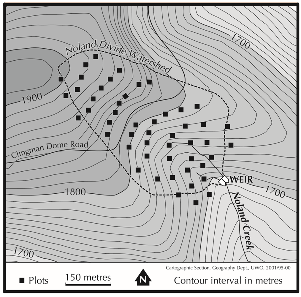Data for the study were collected in the Noland Divide Watershed (NDW, 35°34’N, 83°29’W) a 17.4 ha, high elevation catchment within Great Smoky Mountain National Park. This catchment was chosen because of the broad elevation gradient (1700–1910 m) and resulting variability in overstory species composition thought to represent much of the range of forest conditions occurring within southern Appalachian spruce-fir forests. Access to previously collected data as well as a pre-existing plot infrastructure allowed improved modeling and interpretation of model results through control of some potentially confounding factors (parent material, aspect, and climate). The NDW is dominated by red spruce at lower elevations transitioning into Fraser fir at higher elevations with a component of yellow birch (Betula alleghaniensis Britton) and various other hardwoods distributed across the range of elevations. The NDW has not been impacted by logging or fire [32], but has been severely impacted by the BWA [33,34] and wind related events [15,18]. The soils are mainly Inceptisols, occasionally with spodic characteristics [35,36], are generally shallow, (<50 cm depth to bedrock) and have a silt loam to sandy loam texture [37]. Precipitation is >200 cm annually and is distributed evenly throughout the year [38]. Mean air temperatures range from −2 °C in February to 17 °C in August with a frost-free period from May through September [38,39].
