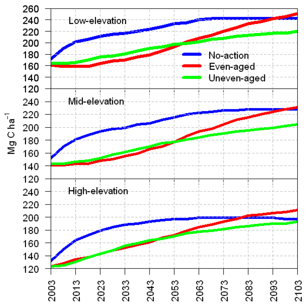 In the uneven-aged scenario, TC similarly began slightly lower than the no-action scenario due to the effects of harvesting at the beginning of the simulation. Sequestration increased from 163, 143 and 124 Mg ha−1 in the low, medium and high elevation band, respectively, through the simulation period with 220, 204 and 193 Mg C ha−1 sequestered by the end of the simulation period in 2103. These values were well below those obtained in the even-aged scenario, which resulted in highest TC values by the end of the simulation period.