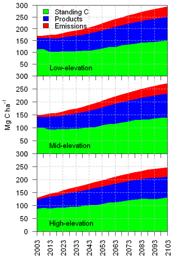 Results from the even-aged scenario were further broken down into 3 major categories in order to demonstrate the fate of various C components in our accounting (Figure 3). The standing C category represented the C stored in the forest. The forest products category represented additional C stored in forest products produced from material removed from the forest over time. These two components together comprised the TC sequestration of the scenario. In addition, a cumulative emissions category represented C lost as emissions from the decomposition of the forest products category. Across the three elevation bands, standing C, products, and emissions accounted for approximately 51%, 34% and 15%, respectively, of the C accounted for over the simulation period.