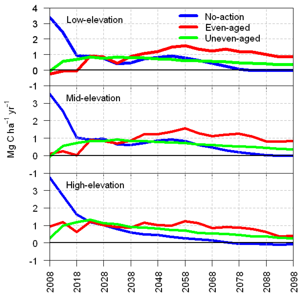 In the even-aged scenario, initial TC (total C sequestered in biomass and forest products) was slightly lower than the no-action scenario due to the effects of harvesting at the beginning of the simulation. This value increased from 161, 141 and 123 Mg ha−1 in the low, medium and high elevation bands, respectively, and continued with a positive slope throughout the simulation period, reaching a value of 250, 231 and 211 Mg ha−1 in the low, medium and high elevation bands, respectively, by the end of the simulation period (2103).