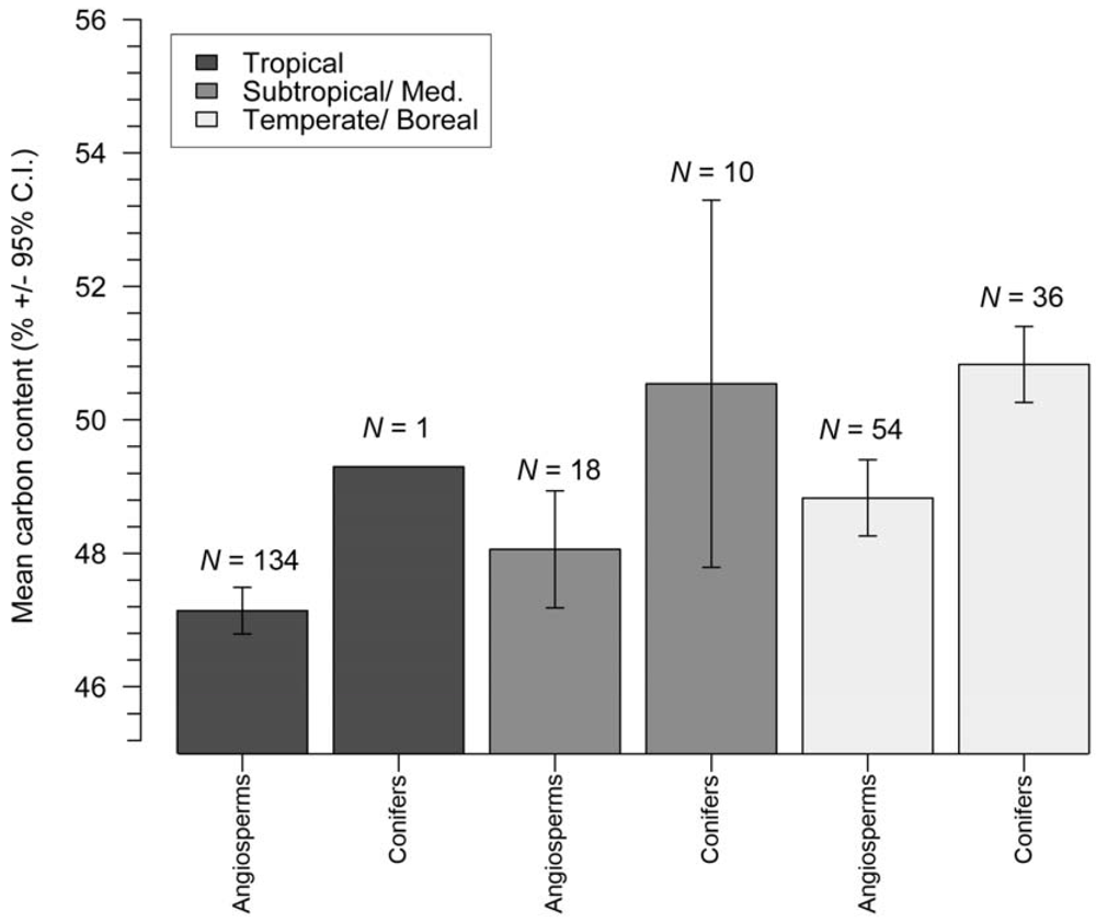 We found a total of 31 published studies reporting species-specific C content data for stem wood, representing 253 species-specific C records (Table 1, see also [44]). Of these, only seven studies provided data for ≥10 species, with the largest dataset including 59 species-specific records (Table 1). Overall subtropical/Mediterranean regions are the most poorly represented, with only 28 total species-specific records available, owing to five peer-reviewed studies (Table 1 and Table 2, Figure 1). Tropical angiosperm species were the most-well represented group with 134 species-specific records found from seven published studies (Table 2), while tropical conifers had the poorest representation with only one species-specific record for Pinus caribaea available (Table 2). In total, angiosperms were better represented compared to conifer species, with 206 vs. 47 species-specific records available, respectively (Table 2).