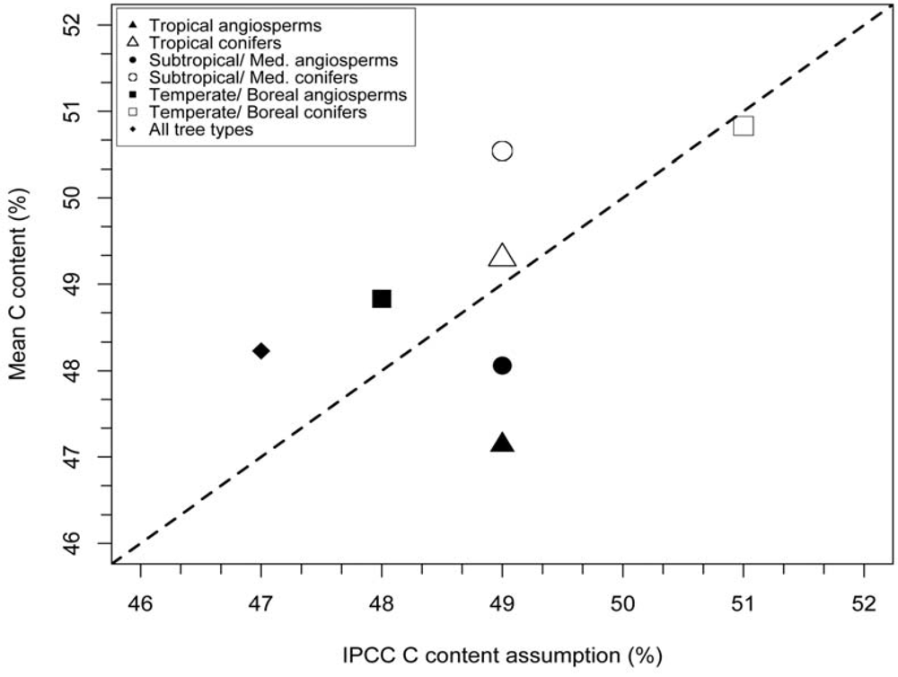 Comparison of wood C fractions suggested by IPCC forest C accounting protocols [30], and mean wood C data found through our literature review (Table 1 andTable 2). Comparisons are presented for tropical (triangles), subtropical/Mediterranean (circles), and temperate/boreal (squares) biomes, grouped by angiosperms (filled symbols) and conifer species (open symbols). Also presented is a general value (closed diamond), corresponding to the “default value” suggested by the IPCC [30], and the grand mean calculated from N = 253 species found in the literature (Table 1 andTable 2). Dashed line represents a 1:1 relationship between IPCC values and observed wood C content (where y intercept = 0 and slope = 1): a linear expectation (where y intercept = 0 and slope = 1) did not fit the relationship (F0,7 = 0.499, p = 0.634).
