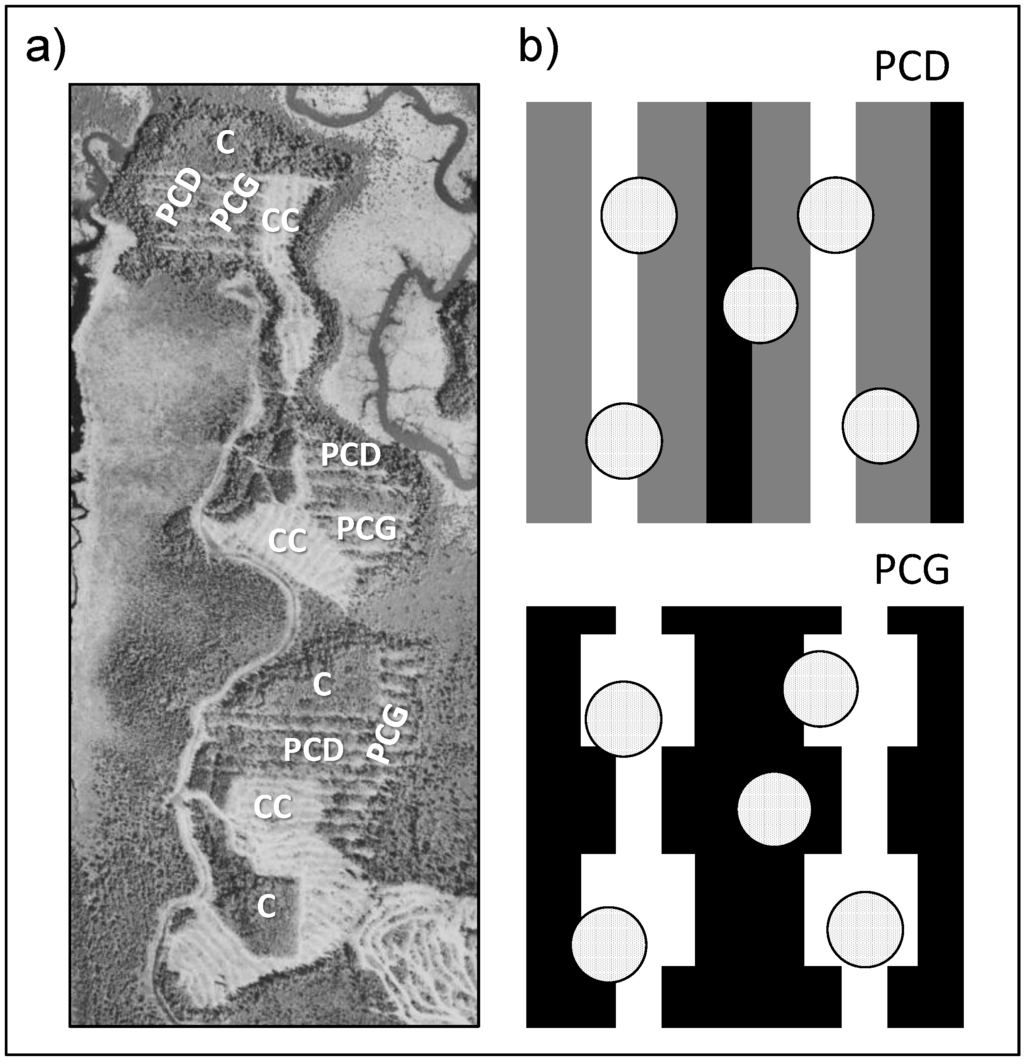 (a) Aerial photo of experiment showing treatment layout and (b) a schematic representation of partial harvesting treatments according to a dispersed pattern (top) and a gap pattern (bottom). Experimental units were 2–3 ha. The basal area removed was 100% in white areas (hauling trails and gaps), 25% in grey areas and 0% in black areas. Doted circles represent 400m2 permanent sampling plots within experimental units. C: control stands; CC: clear cut; PCD: partial cut—dispersed; PCG: partial cut—gap.