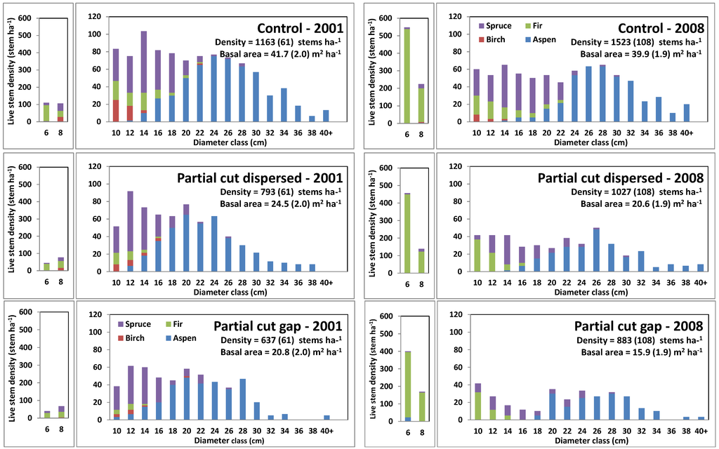 Diameter distribution of live stems immediately (spring of 2001) and eight years (2008), following the partial harvesting of mixed boreal stands. Values in brackets are standard deviations. Total density and basal area values include stems 5 cm diameter at breast height (dbh) and larger.