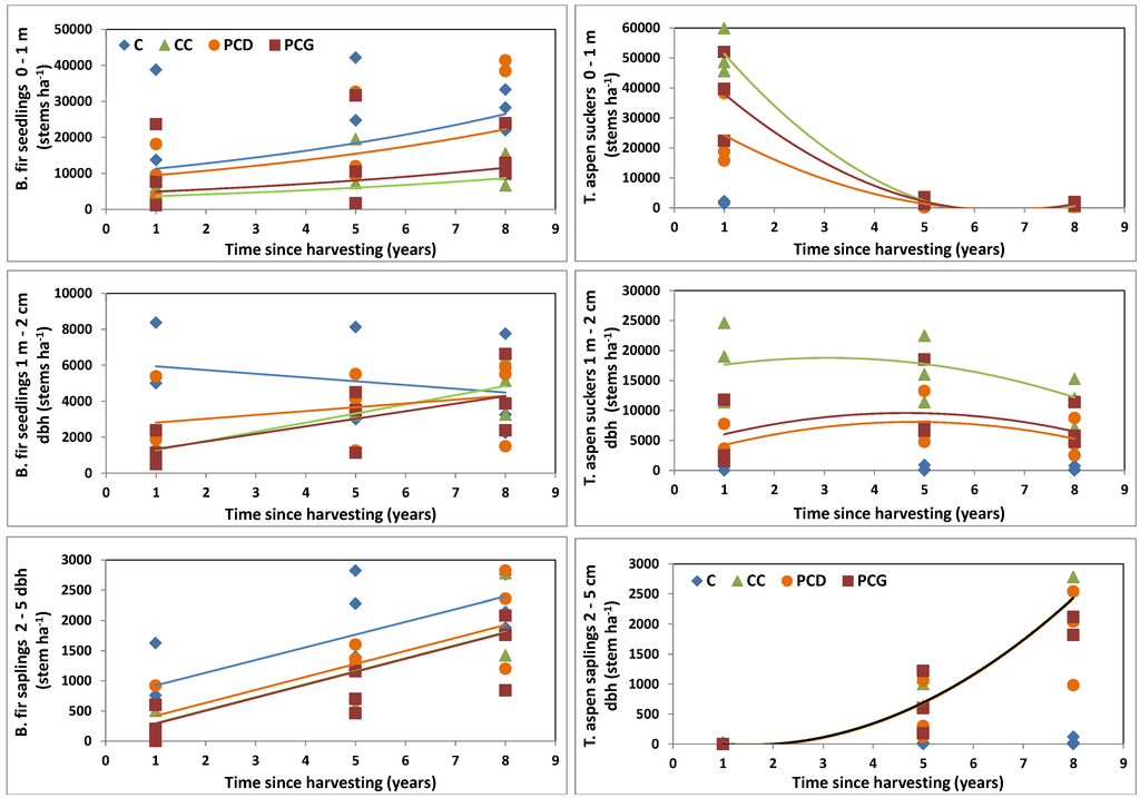 Balsam fir and trembling aspen regeneration densities in mixed boreal stands as a function of harvesting treatment and time since harvesting. Points are average observed values over experimental blocks. Lines are predicted values according to models (see Table 2 for model specifications). Control stand values were not included in statistical models for trembling aspen regeneration, but observed values are displayed in figures. C: control stands; CC: clear cut; PCD: partial cut—dispersed; PCG: partial cut—gap.