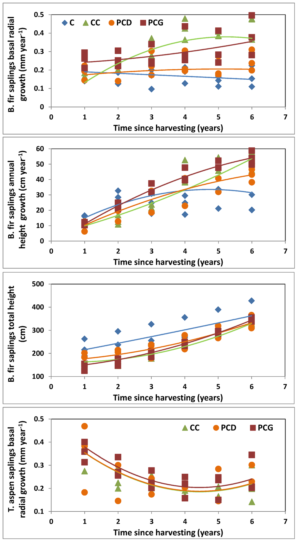 Balsam fir and trembling aspen small saplings growth in mixed boreal stands as a function of treatment and time since harvesting. Points are average observed values over experimental blocks. Lines are predicted values according to models (see Table 2 for model specifications). Control stands observed values for trembling aspen are not presented. C: control stands; CC: clear cut; PCD: partial cut—dispersed; PCG: partial cut—gap.