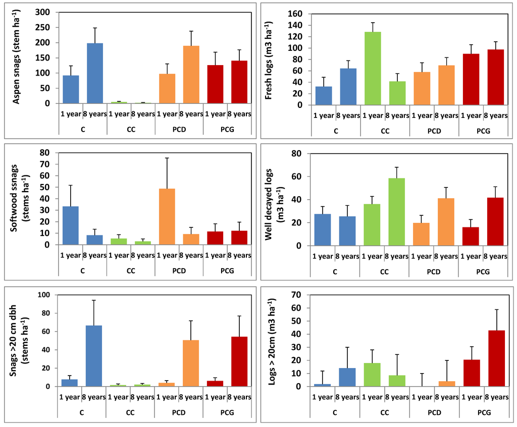 Snag density and downed log volume immediately and eight years following partial and clear cut harvesting of mixed boreal stands. C: control stands; CC: clear cut; PCD: partial cut—dispersed; PCG: partial cut—gap.