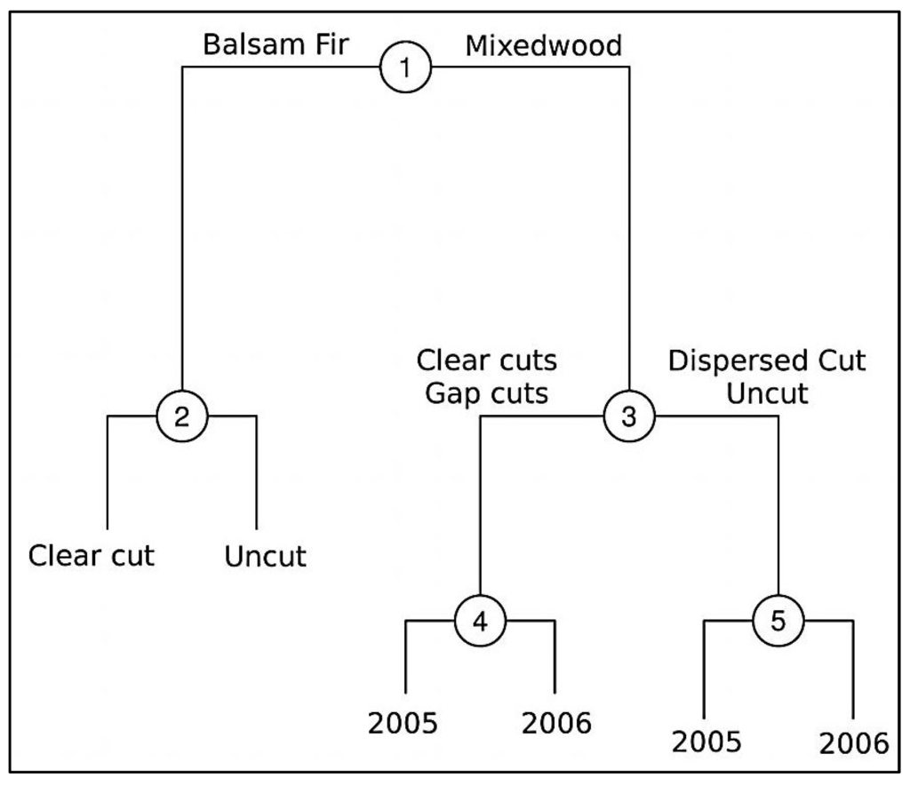 The final splits of the ssMRT imply that the ground beetle assemblages are changing with time. However, at this point, we are unable to discern whether this reflects simple interannual variation or whether this reflects recovery or further diversion of assemblages in harvested stands.