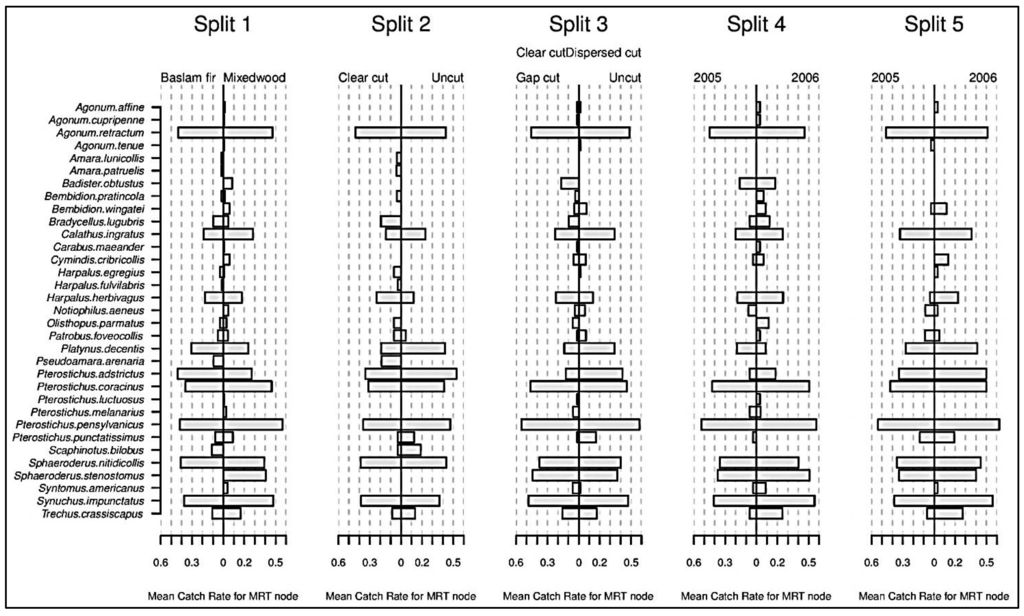 Splits four (4.32%) and five (5.59%) of the ssMRT characterized interannual variation and were dominated by greater catch rates of particular species in 2006. Within the mixedwood clearcuts and gap cuts, relatively more S. impunctatus (0.58%) and Trechus crassiscapus Lindroth (0.87%) were collected in 2006 than in 2005. Within uncut mixedwood stands and those stands with dispersed cut, relatively more T. crassiscapus (1.42%), Harpalus herbivagus (Say) (0.98%), S. impunctatus (0.84%), P. adstrictus (0.69%) and P. decentis (0.51%) were collected in 2006 than in 2005.