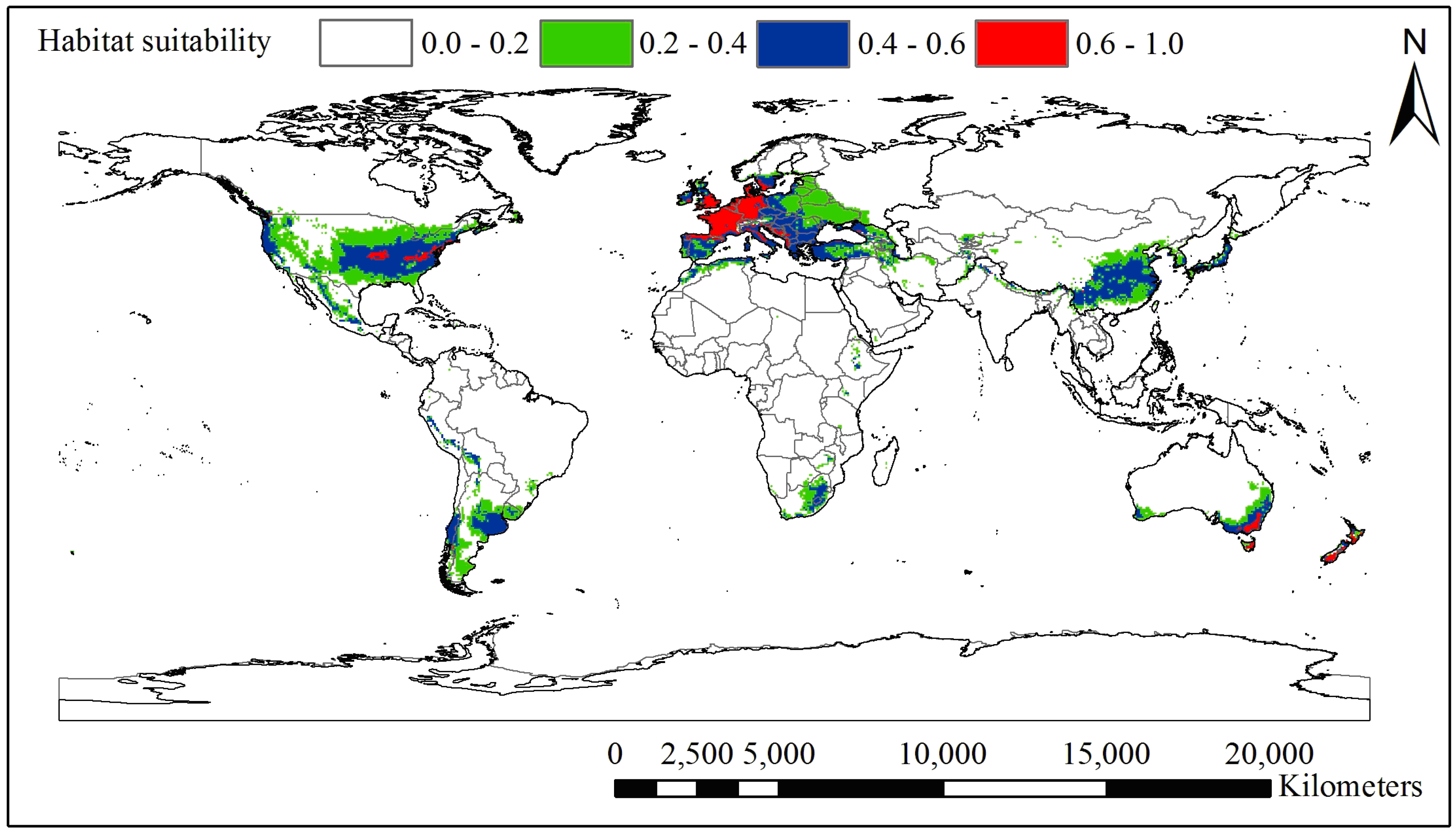 Global potential distribution area of black locust predicted by the MaxEnt model around the world (the grid cell is 0.5° × 0.5°); the value of climatic suitability is the average of a ten-fold cross-validation. The standard deviation of each grid square is 0–0.11.