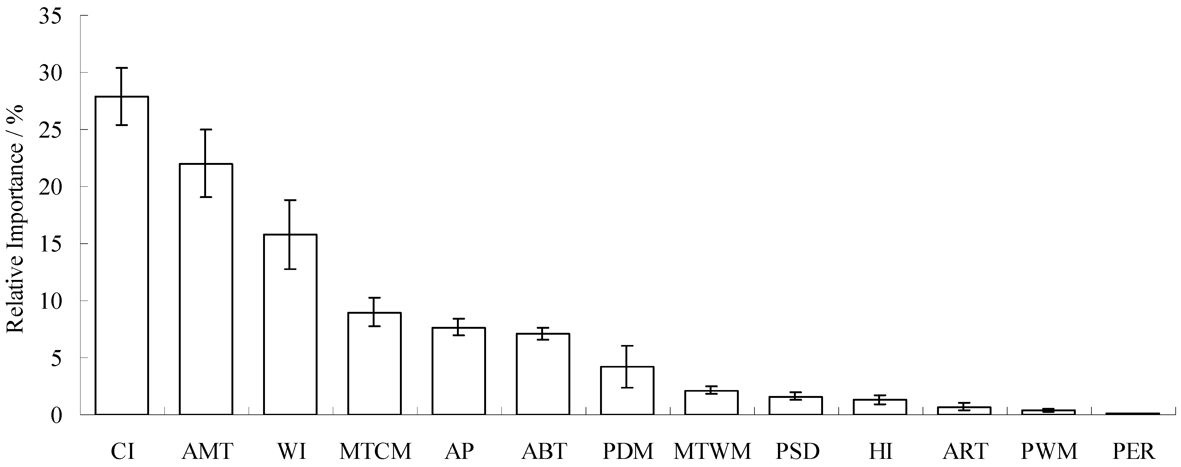 The relative importance of climatic factors (descending in order). The abbreviations CI, AMT, WI, WTCM, AP, ABT, PDM, MTWM, PSD, HI, ART, PWM and PET can be found in Table 1.