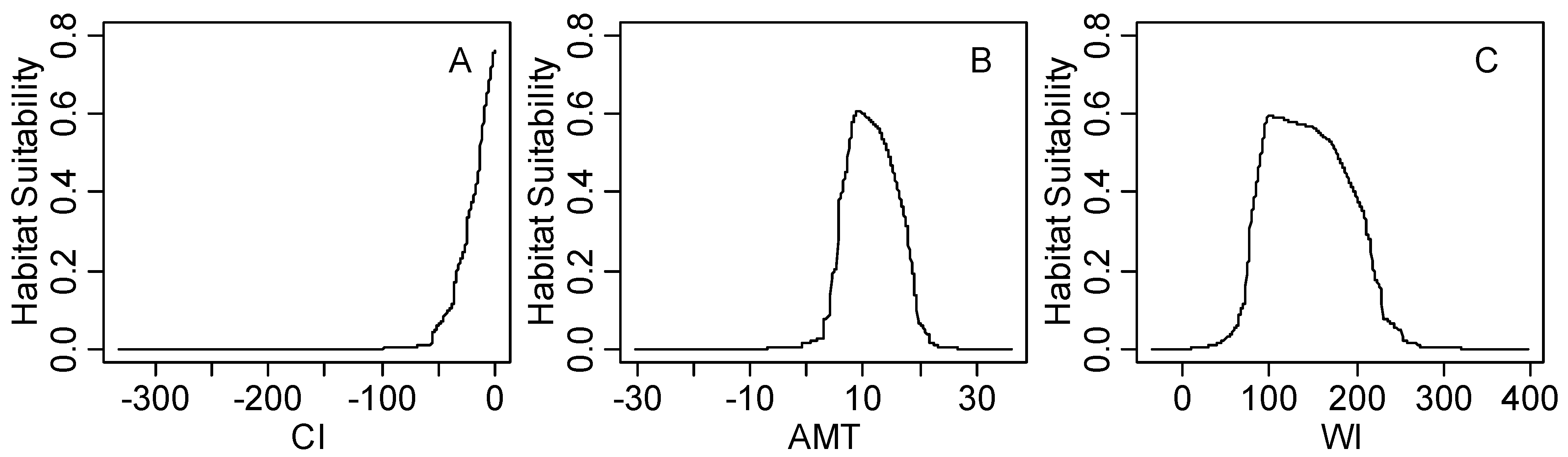 The response curves of black locust under all climatic factors is shown in Figure S1. The first three most important climatic factors (coldness index, annual mean temperature and warmth index) are shown in Figure 5. It is clear that unimodal relationships exist between the habitat suitability value and the annual mean temperature or warmth index, whereas the coldness index shows a linear relationship. The response peak in black locust habitat suitability for the coldness index was at 0 °C; for the annual mean temperature, it was at 9.8 °C; and for the warmth index, it was at 100 °C.