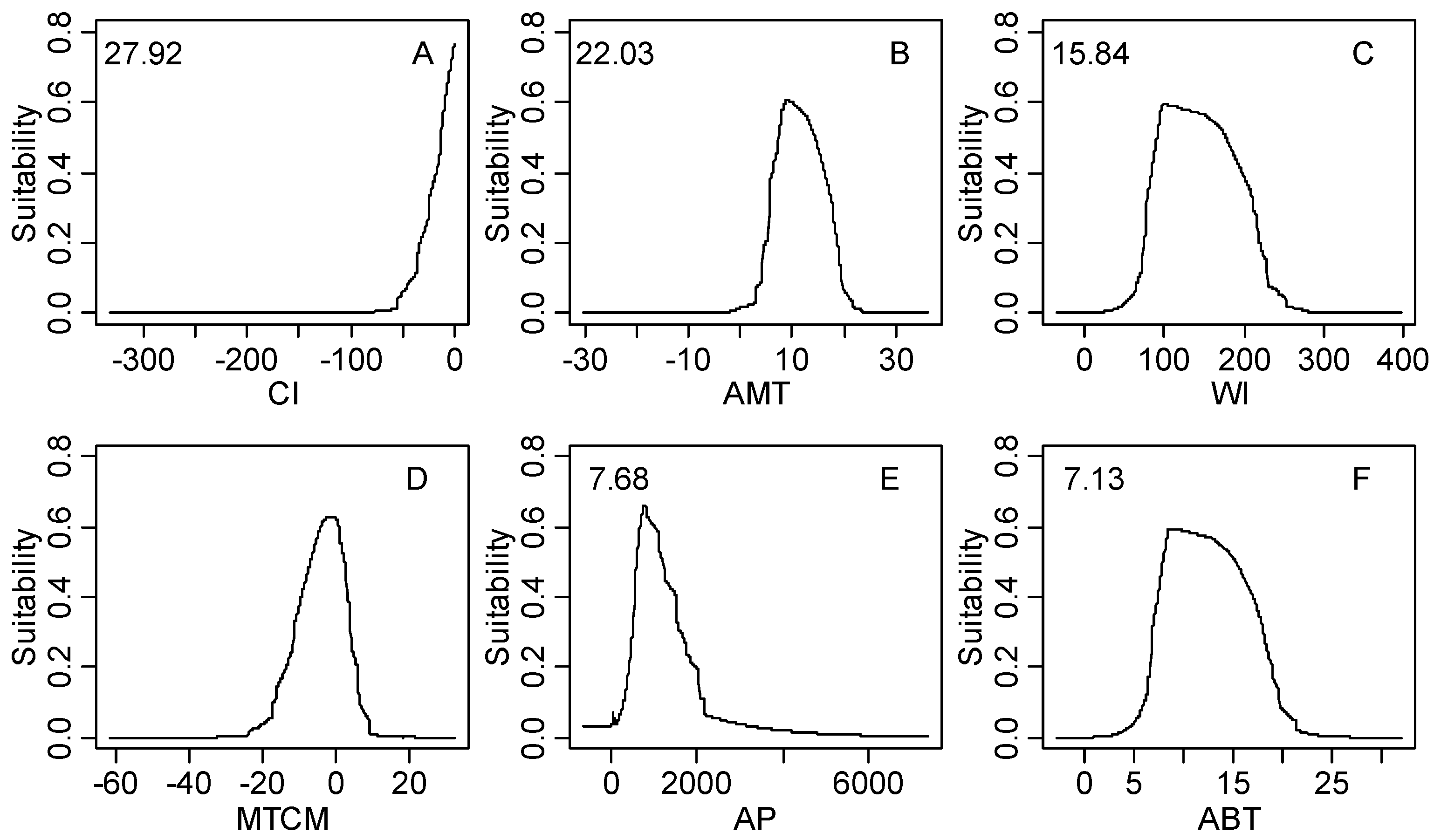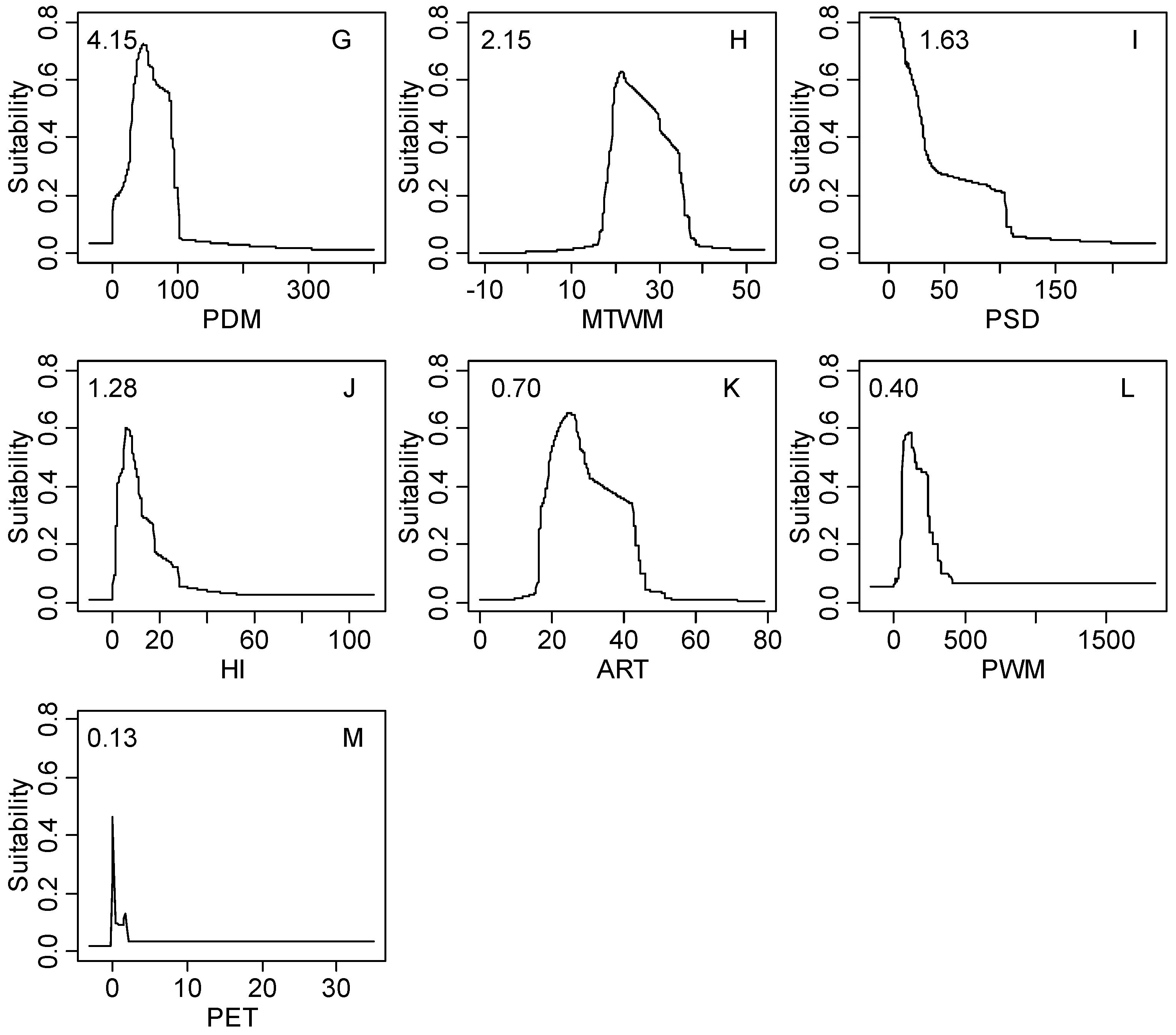 The response curves of climatic habitat suitability values for all climatic factors based on the MaxEnt model decreasing in order based on their relative importance (shown in the upper-left corner of each subplot); (A) Coldness index (CI, °C); (B) annual mean temperature (AMT, °C); (C) warmth index (WI, °C); (D) mean temperature of the coldest month (MTCM, °C); (E) annual precipitation (AP, mm); (F) annual biotemperature (ABT, °C); (G) precipitation of driest month (PDM, mm); (H) mean temperature of the warmest month (MTWM, °C); (I) precipitation of seasonality (PSD, mm); (J) humidity index (HI, mm/°C); (K) annual range of temperature (ART, °C); (L) precipitation of wettest month (PWM); (M) potential evapotranspiration (PET, mm).