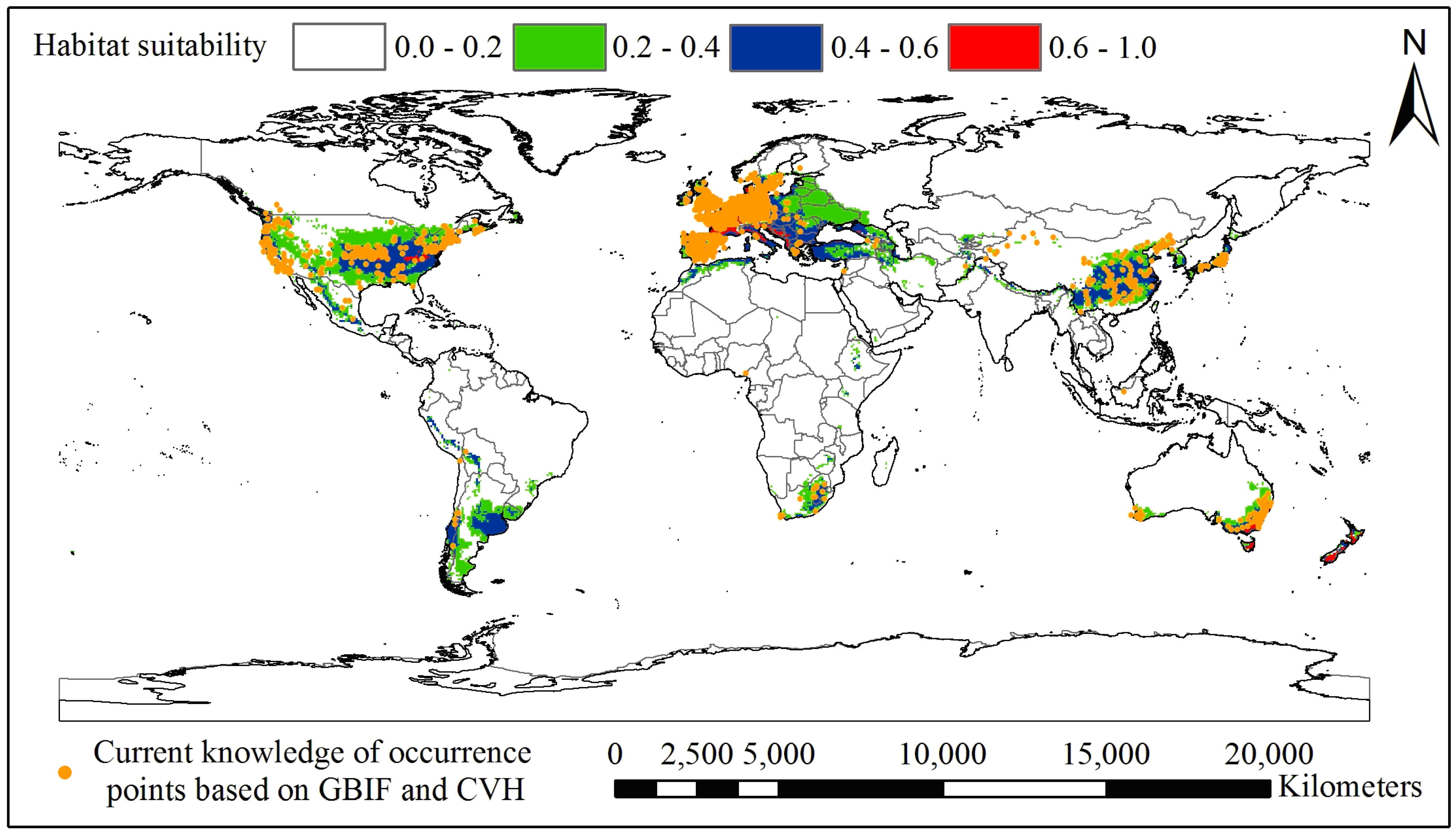 The difference between the current distribution knowledge of GBIF and CVH and the potential distribution of black locust. No occurrence records were found in the following 24 countries: Peru, Uruguay, Brazil, Zimbabwe, Kenya, Ethiopia, Morocco, Algeria, New Zealand, Croatia, Bosnia and Herzegovina, Yugoslavia, Albania, Macedonia, Bulgaria, Turkey, Iran, Azerbaijan, Ukraine, Belarus, Lithuania, Latvia, Estonia and Russia, most of which are developing countries.