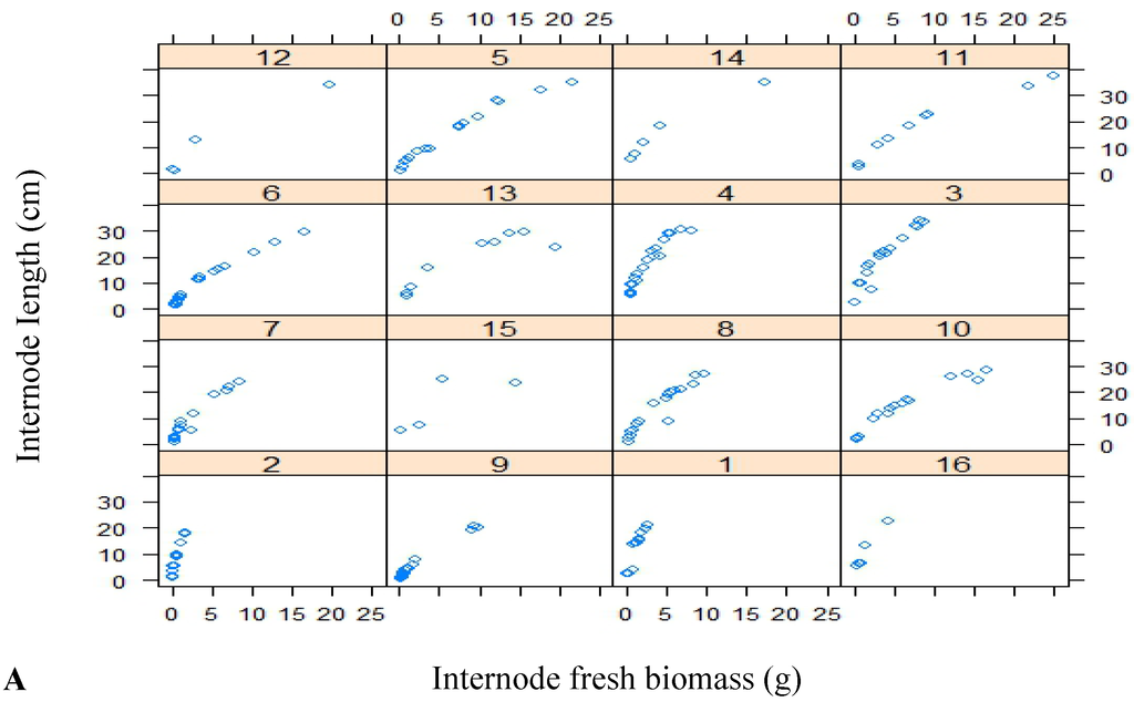 Quantifying the variation in allometric growth is of interest for FSPMs because understanding the variation in allometric internode growth within and between trees should allow us to better understand the underlying tree structure and function. Little is known about the variability in internode allometry; however, such information is essential, both for improving the accuracy of FSPMs and for understanding the mechanisms of tree functioning. It is expected that the allometric relationship of an individual tree deviates from that of a modeled population. Furthermore, the same genetic material occurs within trees; thus, the specification of internodes within trees (i.e. nested random effects) is necessary to model the hierarchical data structure. Internode measurements (length, diameter, and biomass) that are derived from the same tree and branch are not independent. These issues have rarely been described for FSPMs [32,33,34,35,36], with the exception of a single study [37]. There is increasing interest in including the variation among individuals in the modeling of population growth with hierarchical models, in which some parameters are estimated at the level of the population, whereas other parameters are assumed to vary among individuals according to a specific distribution where the mean and the variance of the distribution can be estimated [38,39,40,41]. Recent developments in statistical theory and computational power allow for the specification of multilevel nonlinear mixed-effect models that can generate notable improvements in parameter estimation [42,43]. Analyses of the allometric growth patterns of internodes with mixed-effects models have been limited up until now and could potentially provide valuable biological insights into plant plasticity for FSPMs [37].