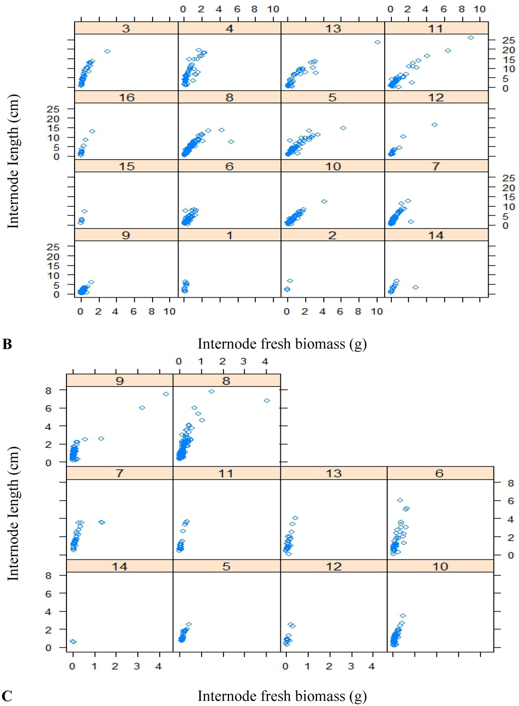 Scatter plots of internode length and biomass for Chinese pine (A: the first-order branches; B: the second-order branches; C: the third-order branches).