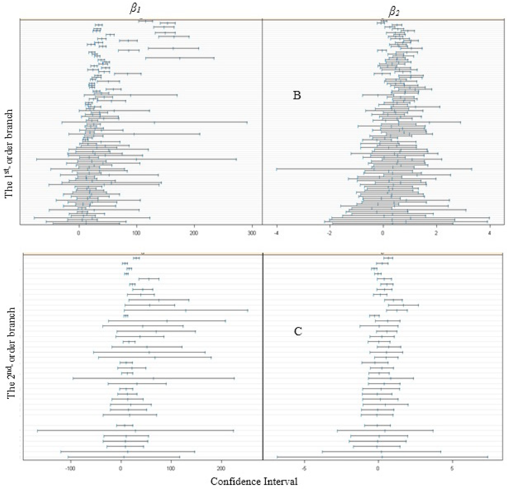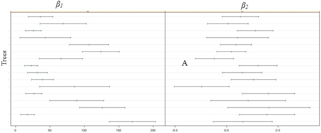 where and are the variance of random parameters b1,k and b2,k on the k level, which describe the inter-tree and -branch variability of the parameters; and are the covariance between random parameters b1,k and b2,k in the Equations (2)–(4); and = .