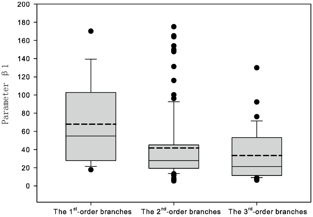 It has been observed from experiments that there are great variations in internode growth within and between trees, even for branches of similar positions and vigor [9,10,11]. For example, distinct quantitative trait loci between the trunk and branches for internode lengthening were detected in apple hybrids [12]; internode length varies regularly with node order [13]. Numerous empirical works have provided evidence of the variability of structural traits within species, between species, and over time [14,15,16]. Pretzsch and Dieler [17] provided empirical evidence that trees exhibit plastic rather than fixed structural scaling; plastic scaling is relevant for space occupation and competition at the individual tree level. Chen et al. [18] found strong elongation of petioles upon submergence as well as both inter- and intra-population variation. Intraspecific functional variability in terms of the extent, structure, and sources of variation was also investigated [19]. There is increasing evidence challenging the assumption that intraspecific variability is much lower than interspecific variability [20,21]. Moreover, the variability of plant allometric equations (scale laws) for relationships such as metabolic rate-biomass [22], tree height-diameter [23,24,25,26], tree productivity-biomass [27], biomass-diameter [28,29], branch radius-branch length [24,30], and foliage and woody mass in crowns [31] has been extensively examined.