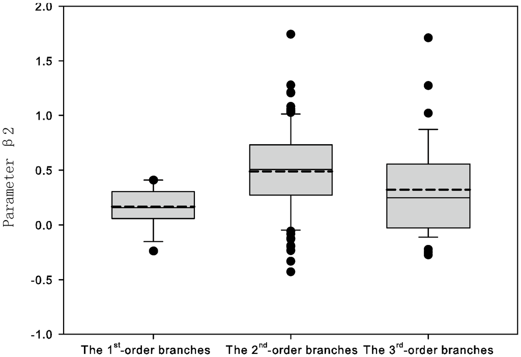Allometric relationships in organisms are considered a universal phenomenon; however, the fact that universal scaling exponents cannot be defined for trees has previously been noted [23,52]. Here we have, for the first time, been able to attribute internode allometry to trees and branches of different orders, and showed the variation of internode allometry at different levels using hierarchical nonlinear mixed-effect models. These mixed models provided more accurate parameter estimations. We found significant variability in internode allometry within and between trees and branches, which was quantified as the variances of the random effects of shape and geometric parameters in the model. Of the random variation, the variation in the allometric relationships occurring between trees was much greater than that between branches, and variation between lower-order branches was much greater than between higher-order branches. We also tested Equation (1) after log-transformation of both sides, i.e. Ln(L) and Ln (Q) were treated as dependent and independent variables, respectively. The log-transformed equation, however, did not change our conclusion on the variation of allometry among different scales. Additionally, the values of scaling coefficient increased from the first- to third-level branches but the values of scaling exponent showed the opposite, which implies a complicated biomass allocation pattern. This may be attributed to the nonlinear relationship between biomass and length, characterized as a convex downward curve on the log-log coordinates. It is tempting to consider our findings with regard to the debate surrounding the mechanistic basis of metabolic scaling explained through the West, Brown, and Enquist (WBE) theory [53] or the Dynamic Energy Budget (DEB) theory [54,55,56,57,58,59,60]. Our results on the allometry between internode length and biomass were inconsistent with universal models such as elastic similarity, stress similarity, geometric similarity, and WBE, according to the results of Price [15]. This may further confirm the conclusion that universal scaling exponents cannot be defined for trees [23,52].