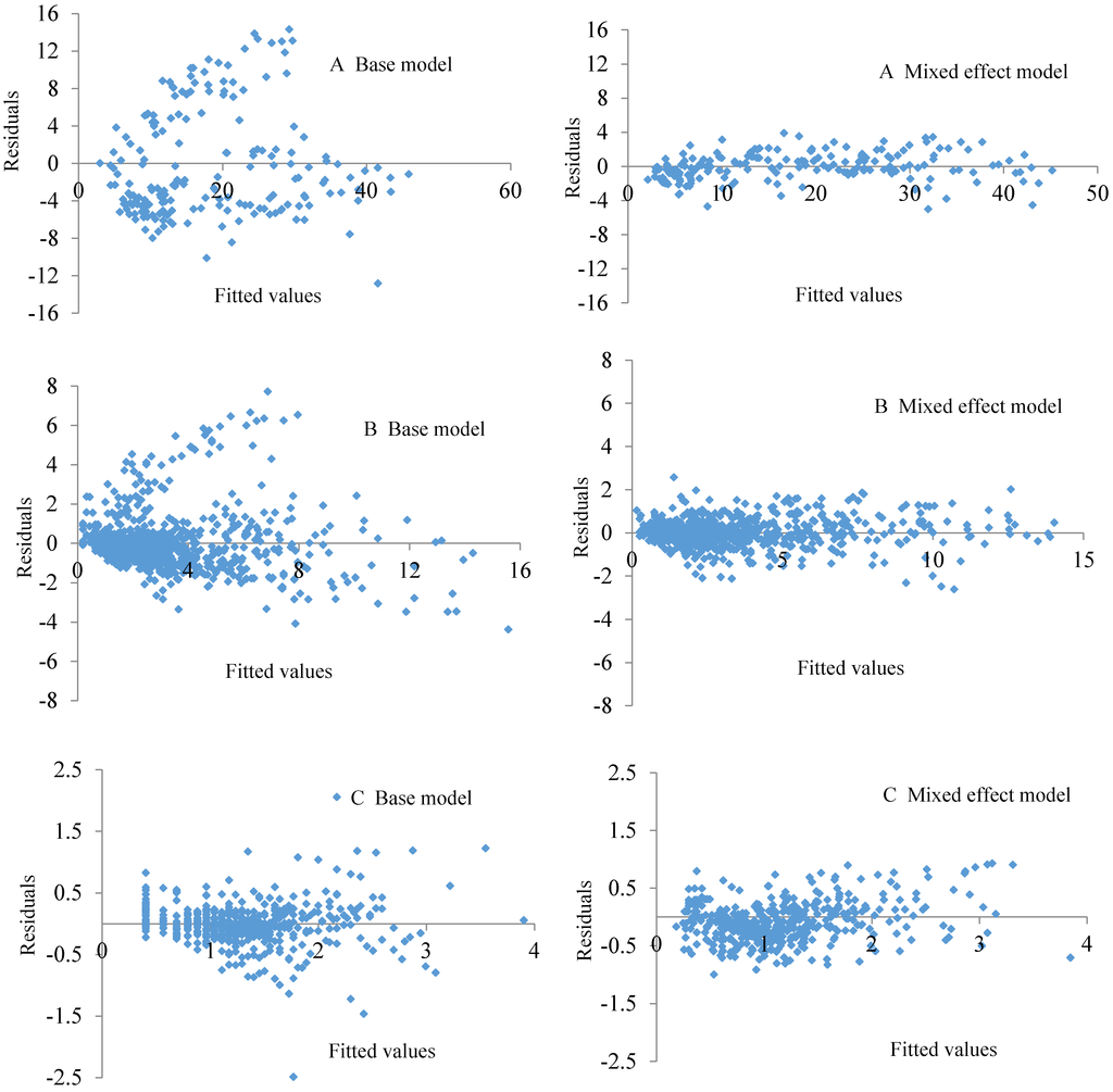 The distributions of residuals for the base models and mixed-effect models (A: First-order branches; B: Second-order branches; C: Third-order branches).