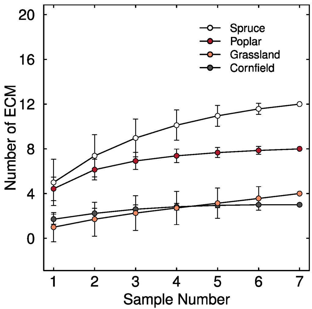 - Bahram, M.; Põlme, S.; Kõljalg, U.; Tedersoo, L. A single European aspen (Populus tremula) tree individual may potentially harbuor dozens of Cenococcum geophilum ITS genotypes and hundreds of species of ectomycorrhizal fungi. FEMS Microbiol. Ecol. 2011, 75, 313–320. [Google Scholar] [CrossRef] [PubMed]