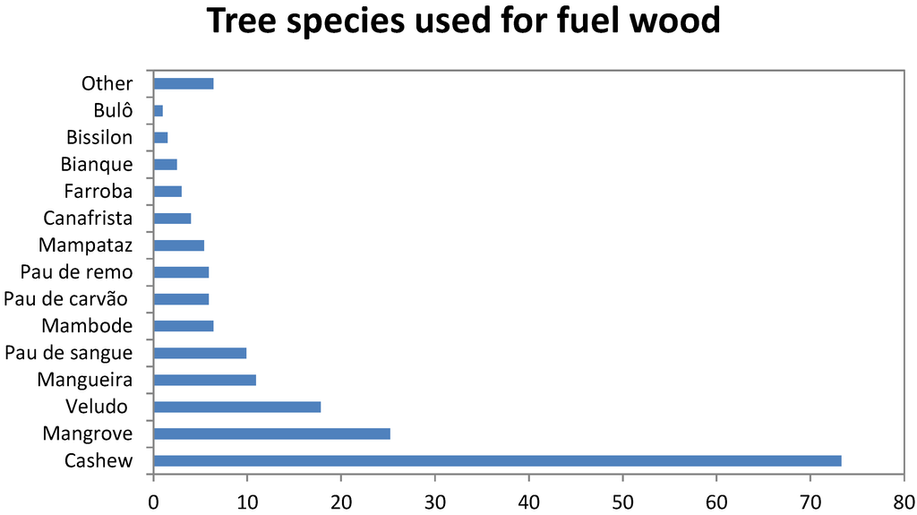 Tree species used for fuel wood: Bulô—Setara pumila; Bissilon—Khaya senegalensis; Bianque—Alstonia boonei; Farroba—Albizzia gummifera; Canafistra-Peltophorum dubium; Mampataz—Parinari excelsa; Pau de remo—Sapotaceae; Pau de Carvão—Prosopis africana; Mambode—Detarium senegalense; Pau de sangue—Pterocarpus violaceus; Mangueira—Mangifera indica L.; Veludo—Dialium guineense. Mangrove—Rhizophora; Cashew—Anacardium occidentale L.