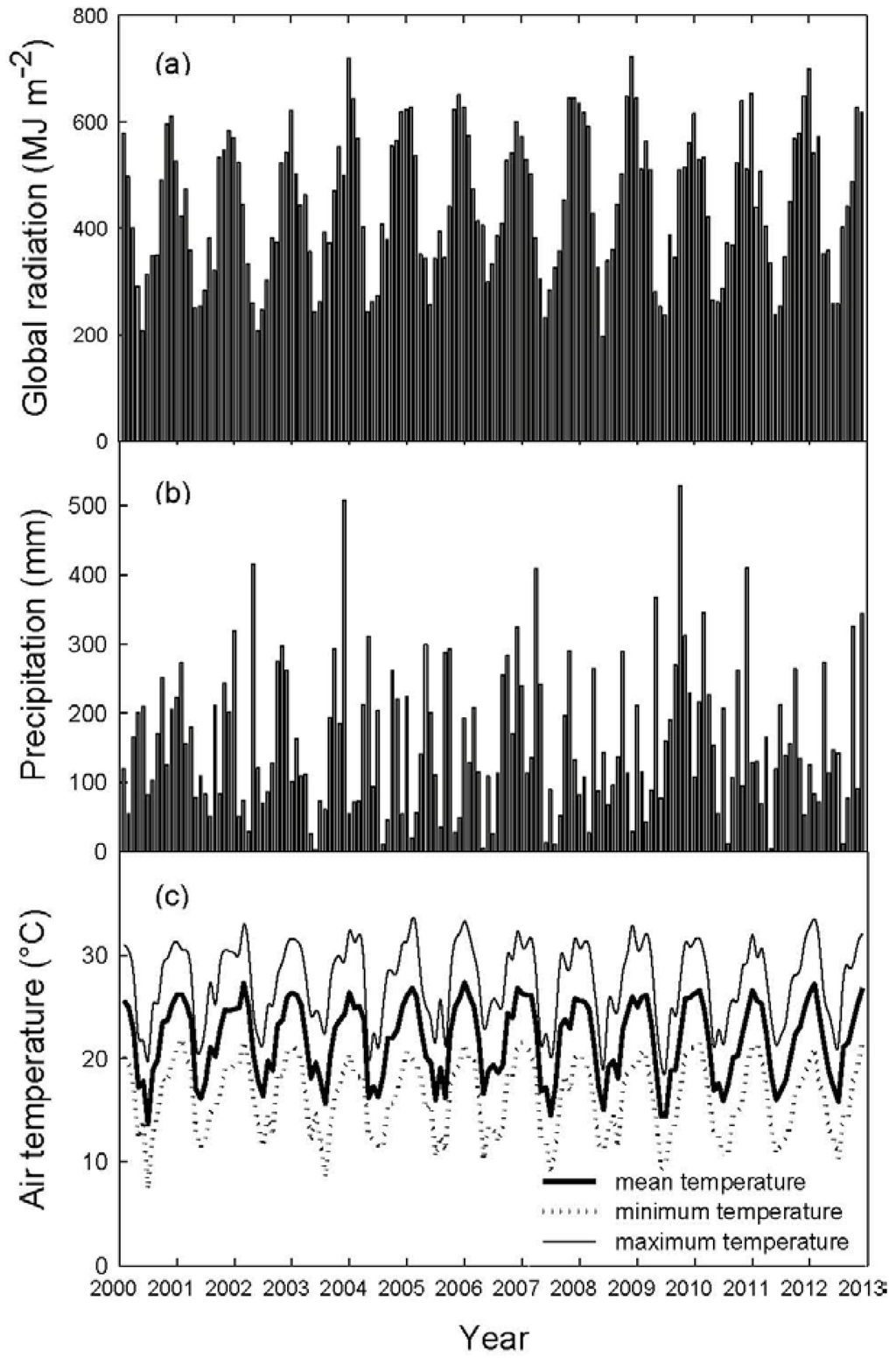 Seasonal variations of (a) monthly global radiation, (b) monthly total precipitation, and (c) monthly air temperatures obtained from daily mean temperatures from 2000 until 2012 (Puerto Iguazú-Aero Meteorological Station, Argentina).