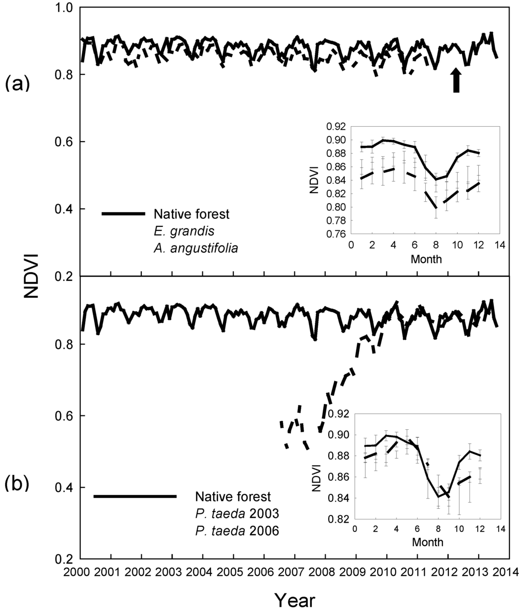 The decreased NDVI in the cold season was consistent with the seasonal pattern of LAI. The substantial decrease in LAI is at least partially responsible for the small seasonal decline in NDVI. The LAI estimates by remote sensing were within the LAI range measured in the field. MODIS LAI varied seasonally from 4.7 to 6.4 across native forests and plantations. The field estimates of LAI depicted relatively high values of about 6.7 for native forest stands and for the A. angustifolia tree plantation. The other tree plantations ranged from 3.7 to 4.3. It has been suggested that the MODIS LAI product for conifer forests underestimated the LAI values compared to field measurements []. LAI values observed in our study were similar to the average values of LAI in other forest ecosystems. For example, Yang et al. [] found LAI values for broadleaf forests in North America between 4.5 and 6 through different simulation models with Terra and Aqua MODIS sensors. However values of LAI for needle leaf forests were lower ranging from 2 to 3.5. In boreal deciduous and coniferous forests, LAI values from MODIS were relatively lower (2.2) than field estimates with hemispherical digital photographs (3.0) []. LAI values for boreal forests are expected to be substantially lower than LAI in tropical and subtropical forests.