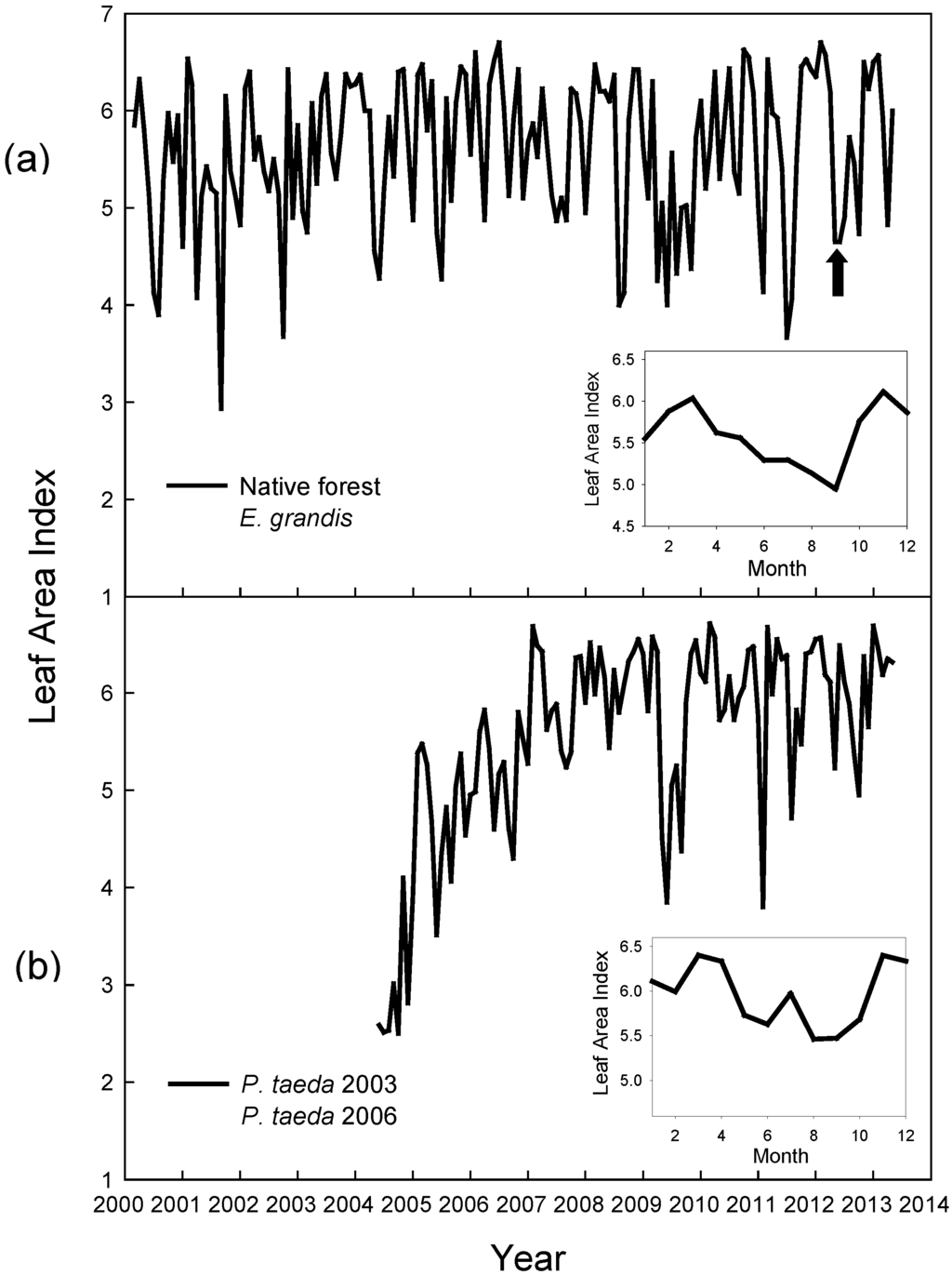 Monthly MODIS LAI (Leaf Area Index) from 2000 to 2013 of (a) a native forest and Eucalyptus grandis and (b) two tree plantations of Pinus taeda planted in different years. The black arrow in panel (a) indicates the time when the A. angustifolia and E. grandis plantations were cleared. Inset: annual dynamic of LAI obtained from the monthly averages of the: 2000 to 2013 time series for the native forest, 2000 to 2012 for E. grandis, and for 2009 to 2013 for both P. taeda species. Numbers 1 through 12 in the X-axis insets correspond to January through December.