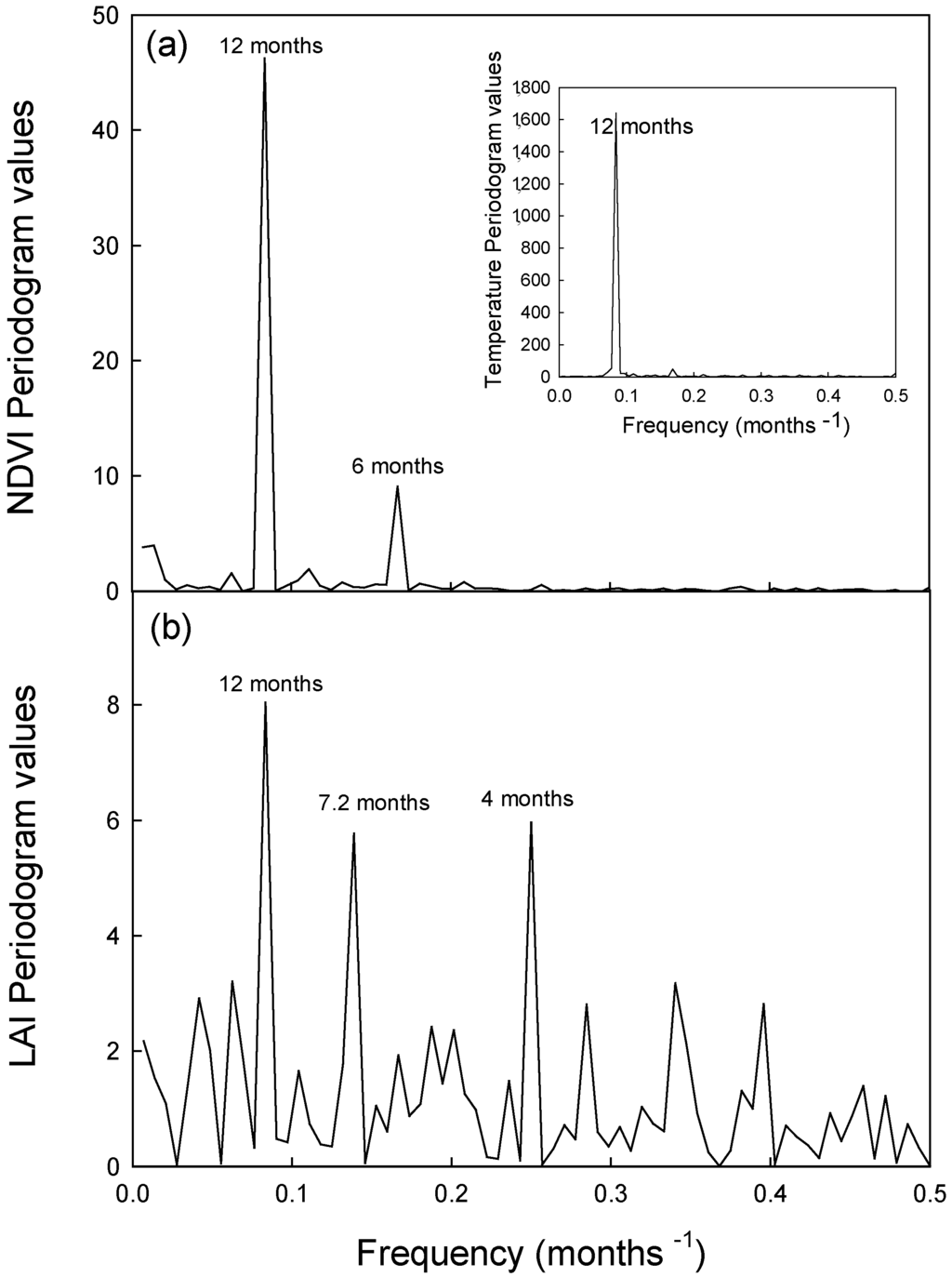 (a) NDVI (Normalized Difference Vegetation Index) and (b) LAI (Leaf Area Index) peridograms for the native forests. The Y-axes are the percent of variance explained at each frequency, the inverse of the time periods in months. In the inset, the periodogram of average monthly temperatures for a 12-year period is shown.