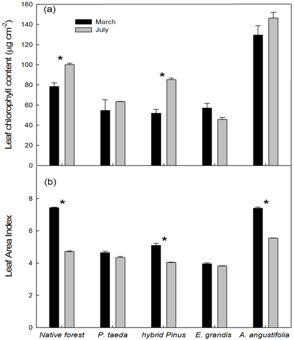 Field measurements of (a) chlorophyll content and (b) Leaf Area Index for two months: March (black bars) and July (grey bars), corresponding to summer and cold seasons, respectively. Bars are means + SE. In tree plantations n = 3 for chlorophyll content and n = 10 for LAI. In the native forest stands n = 5 for chlorophyll content and n = 30 for LAI. * Indicates significant differences between times (March and July) within each ecosystem type at p < 0.05.