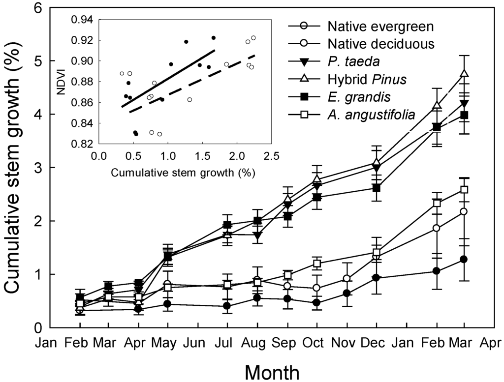 Cumulative stem diameter changes (percentage growth normalized to the initial stem diameter) for deciduous and evergreen trees in the native forest and four tree plantations from February 2012 to March 2013. Vertical bars in March 2013 indicate the SE. The inset indicates the significant relationship (p < 0.05) between NDVI and the cumulative stem growth of native evergreen species (black circles and solid line, R2 = 0.42) and the native deciduous species (white circles and dash-dot line, R2 = 0.47).