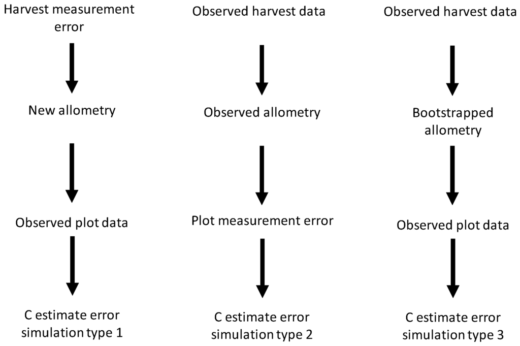 Figure 2 provides a schematic representation of how different sources of uncertainty were combined. When combining harvest shrub measurement errors with plot measurement errors (simulation type 4), we first ran 1000 harvest error simulations. For each simulation, the new harvest measurement values were used to generate values for the allometric linear coefficient and intercept. The simulated coefficient values were then used to estimate C on 1000 plot measurement error simulations (giving 106 simulations in total). When combining harvest measurement error and bootstrapped allometric uncertainty (simulation type 5) for each harvest error simulation we generated 1000 bootstrapped values for the linear coefficient and intercept, and then combined these coefficient values with the observed measurements for shrubs in plots to estimate C storage (again giving 106 simulations in total). When combining bootstrapped allometric uncertainty and plot measurement errors (simulation type 6) for each bootstrapped estimate of allometric coefficients we ran 1000 plot measurement error simulations. When combining all three sources of uncertainty (simulation type 7), we used 1000 harvest measurement error simulations. For each harvest error simulation, we generated 1000 bootstrapped values for the allometric coefficients and then ran 1000 plot measurement error simulations (giving 109 simulations in total).