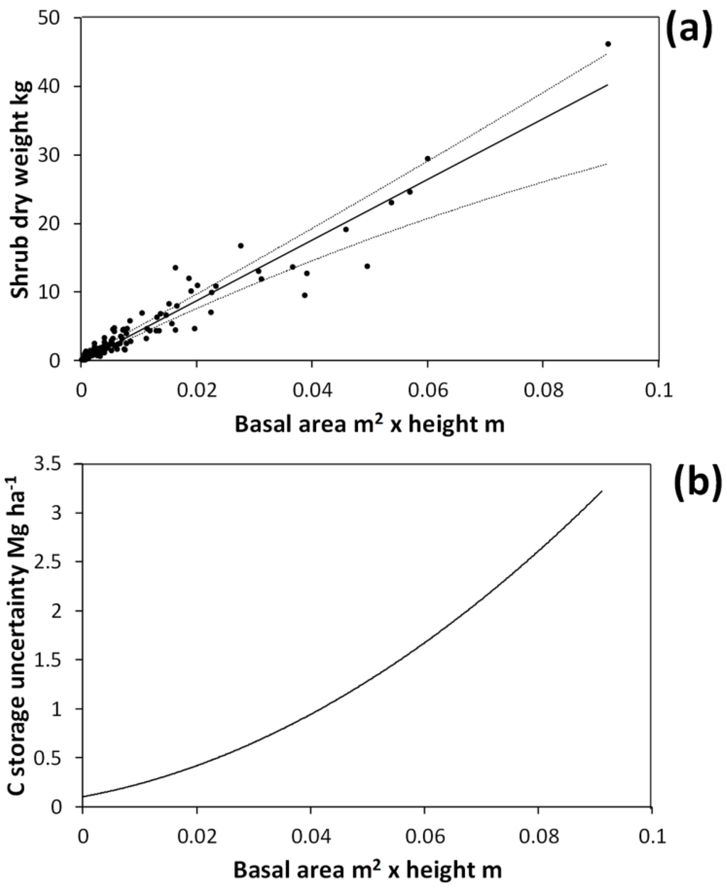 Allometric relationship between harvested shrub dry weight and shrub total basal area multiplied by shrub height (a). This curve was obtained by fitting the equation: Dry weight = exp(a • ln(basal area • height) + b). Solid line in (a) shows the curve fitted on the entire harvested shrub dataset with a = 1.0215 and b = 6.1512. Dotted lines show the upper and lower bounds of the 95% confidence interval for predicted values under bootstrapping. Confidence interval breadths for predicted values are expressed in terms of carbon (C) storage in (b).