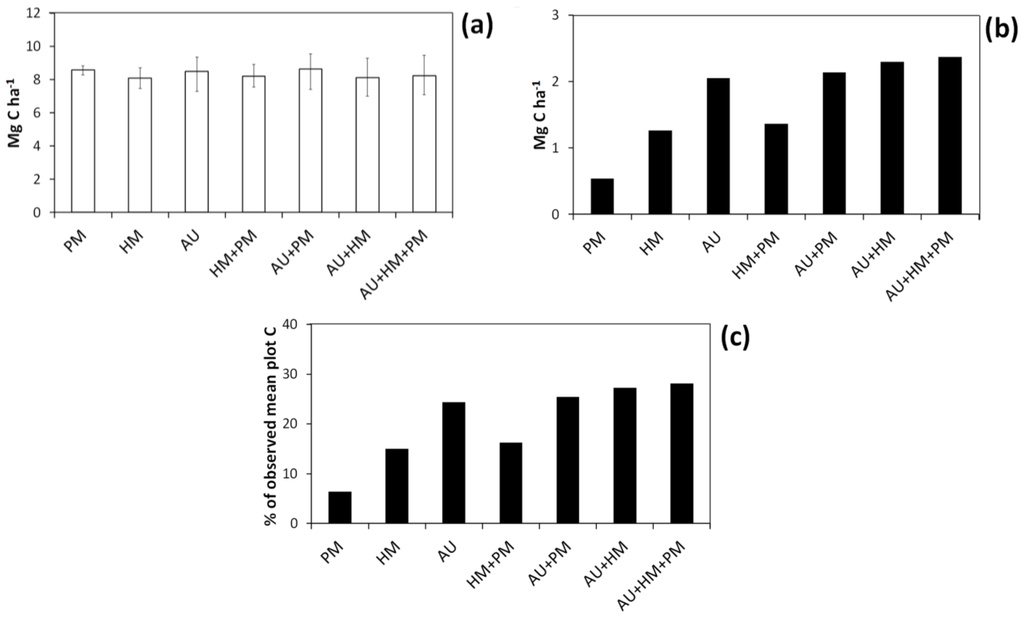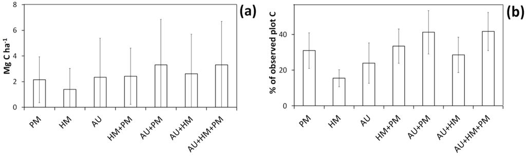 In all of the re-measured plots, C storage in 2012 was greater than for 2008 (Figure 9a). C storage in 2012 also exceeded the 95% CI of simulated values for the 2008 measurement in all of the re-measured plots. This indicates that, for all re-measured plots, increases in estimated C storage were beyond the bounds of C estimate uncertainty for 2008 estimates.