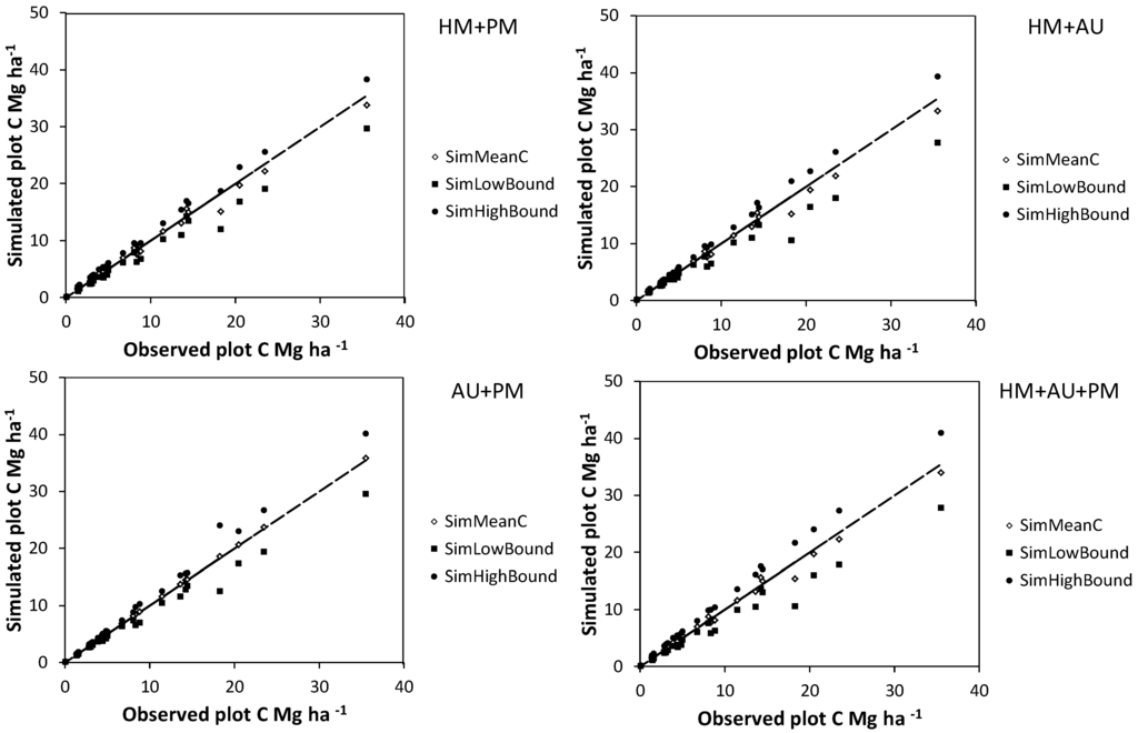 Mean (SimMeanC) and lower and upper 95% confidence interval limits (SimHighBound and SimLowBound) for carbon (C) estimate uncertainty simulations using the basal area approach. Simulated sources of uncertainty were diameter and height measurement errors for harvested shrubs (HM), bootstrapped allometry uncertainty (AU), and diameter and height measurement errors for shrubs on plots (PM). The trend lines indicate a y = x curve.