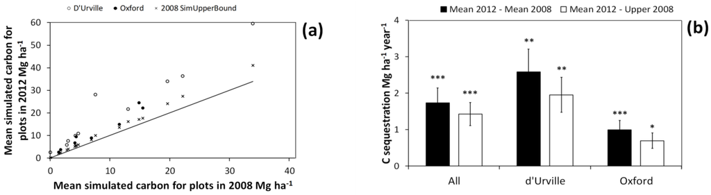 Mean simulated carbon (C) storage estimates for individual plots in the 2012 measurement vs. that for 2008 (a). The line indicates a y = x curve. 2008 SimUpperBound is the upper bound of 95% confidence interval for simulated C estimates of individual plots in the 2008 measurement. The confidence intervals in (a) were taken from the simulations including all three error sources: harvest shrub measurement error, plot shrub measurement error, and bootstrapped allometry uncertainty (i.e., simulation type 7); (b) Mean and standard error of C sequestration across all plots and those in either the d’Urville or Oxford site. Mean 2012−Mean 2008 refers to C sequestration estimates using the mean of the simulated values (for each plot) in both 2012 and 2008, while Mean 2012−Upper 2008 refers to estimates derived by subtracting the upper bound of 95% confidence interval for each plot in 2008 from the mean of simulated values in 2012. This provides a test of whether or not we can detect C sequestration beyond the margin of error introduced by the uncertainty sources we simulated. Significance of paired t-tests for differences in C storage between 2008 and 2012 are as follows: * p < 0.05; ** p < 0.01; *** p < 0.001.