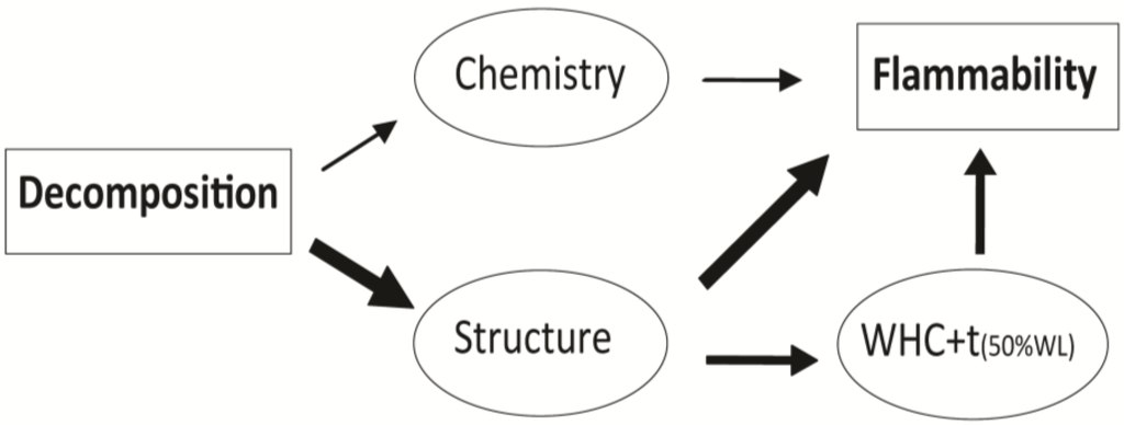 Decomposition had a range of direct and indirect effects on single twig flammability. As twigs decompose, their woody material is metabolized by invertebrates, fungi, and bacteria [6,30,31]. During this process, wood density decreases and porosity increases [33], with this change affecting flammability both directly and indirectly via the water dynamics of twigs. Consistent with our hypothesis (Figure 1), the change in structure during decomposition is the main factor influencing twig water properties and flammability. In this discussion, we first consider the indirect effects of decomposition through influencing twig water dynamics and then the direct effects of decomposition on twig flammability and the relative strength of those direct and indirect effects.