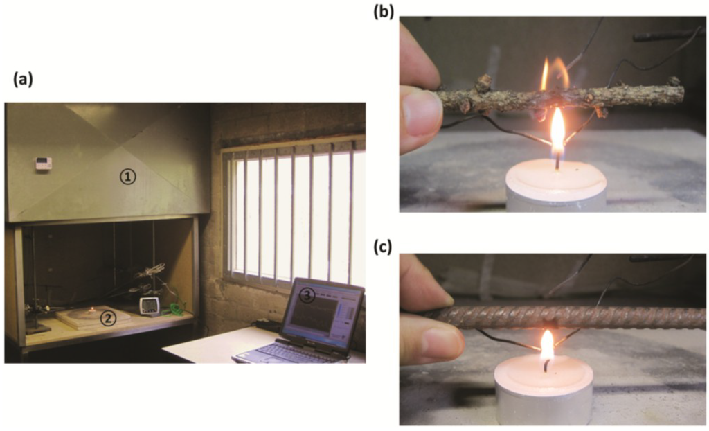 (a) the Fire Laboratory of Amsterdam for Research in Ecology (FLARE); ①Fume hood, ②fire resistant plate, and ③laptop running TC Meas program for temperature data recording; (b) Twig burning. Three thermocouples were placed: one was approximately 1.5 cm above the source flame tip and the other two were at the sides of the source flame; (c) Background burning with a metal bar. Three thermocouples were placed: one was approximately 1.5 cm above the source flame tip and the other two were at the sides of the source flame.
