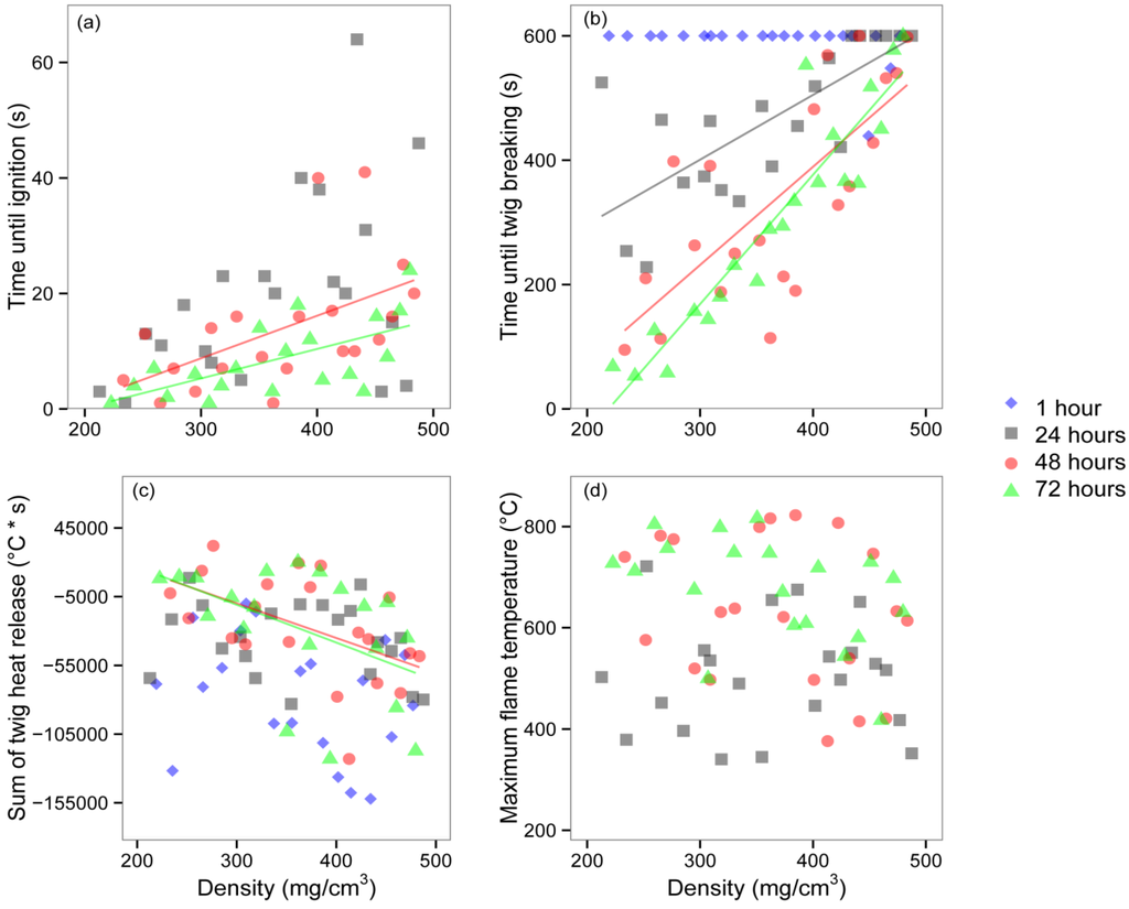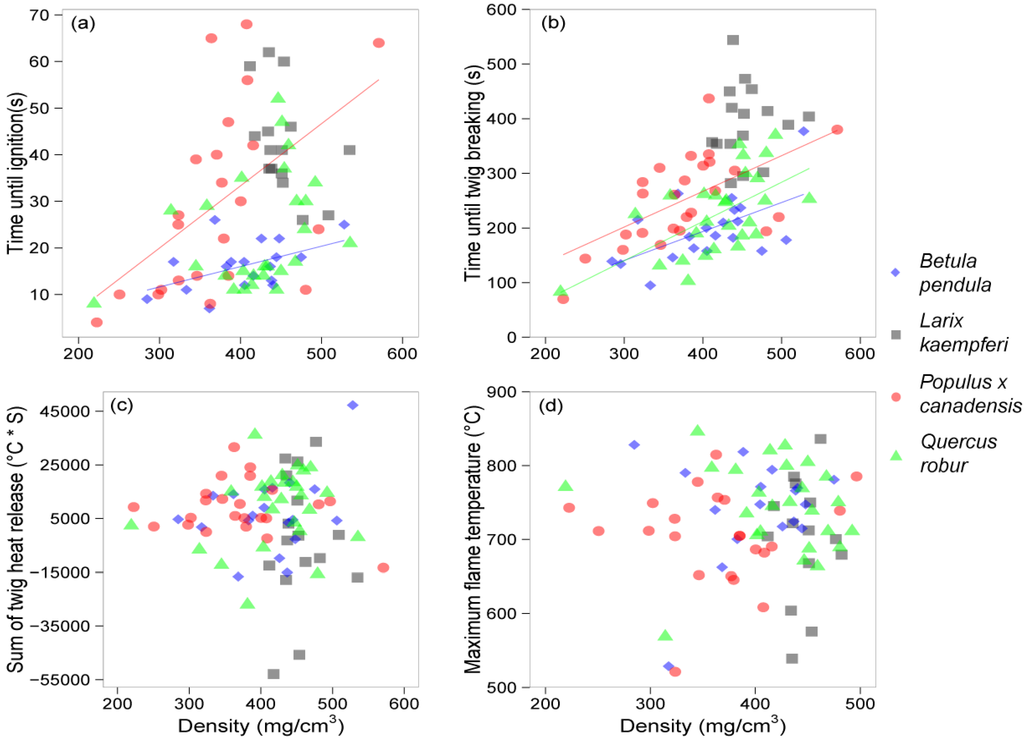 Density versus flammability variables of air-dried twigs of all four species: (a) time until ignition, (b) time until twig breaking, (c) sum of twig heat release and (d) maximum flame temperature; Only significant relationships within species are shown with regression lines (Table 1).