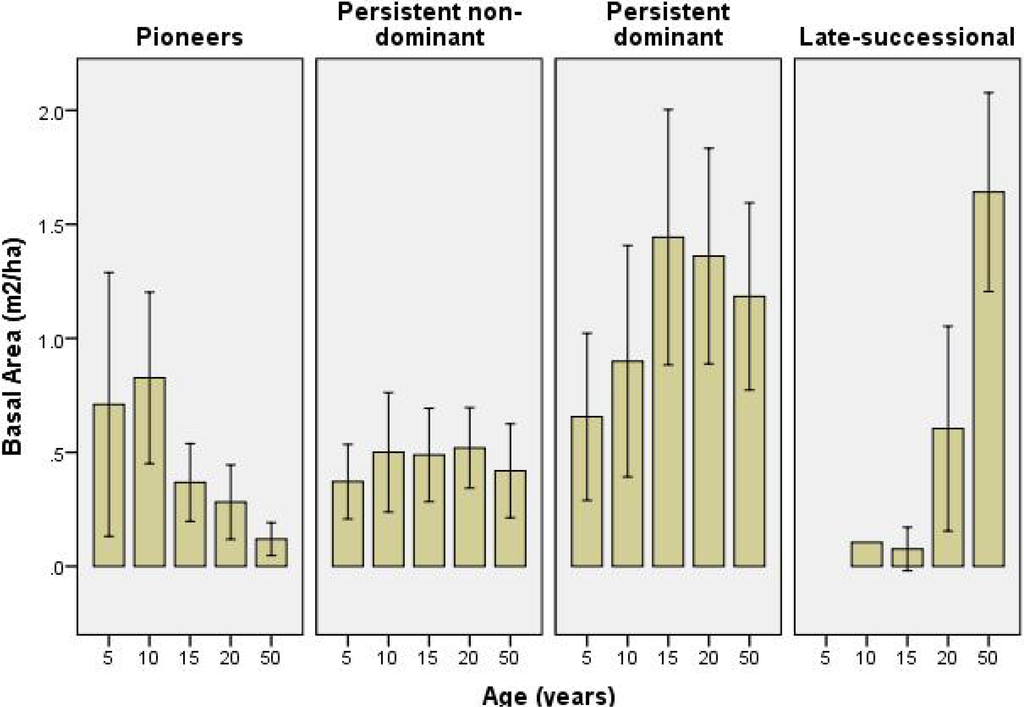 Basal area within successional groups across seasonal semi-evergreen forest stands, with abandonment times ranging from 5 to 50 years in the Yucatan Peninsula region.