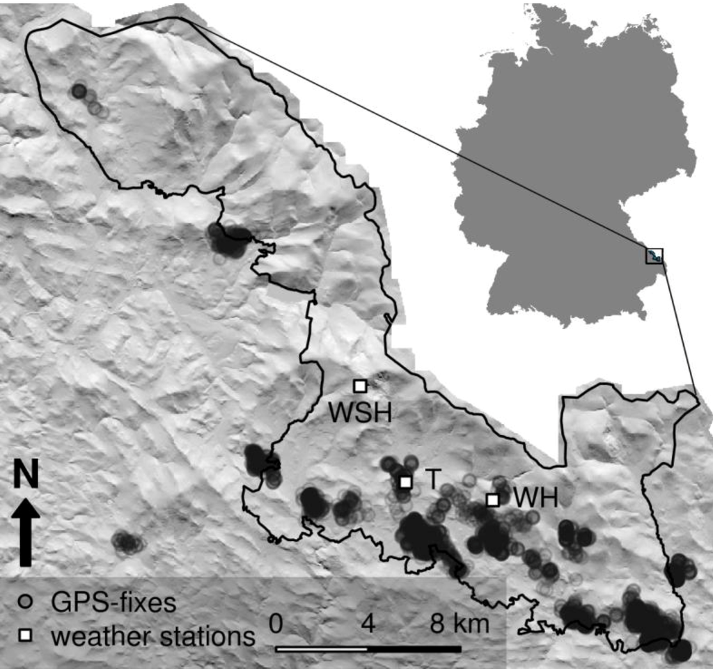 Understanding a species’ habitat selection is a major prerequisite for wildlife management, concerning both conservation and forest management. Habitat selection can be analyzed at a very fine spatio-temporal resolution using GPS telemetry, which provides location data of cryptic organisms on an almost continuous scale []. Indeed, the availability of environmental covariates at an adequate spatial resolution to resolve site selection at the scale of the GPS telemetry data is an important methodological challenge, as conventional field measurement techniques require a prohibitively high effort when covering large areas []. High-resolution remote sensing, such as airborne Laser scanning (LiDAR, Light detection and ranging), promises to provide the unique possibility to describe forest structure in high detail and over large areas [].
