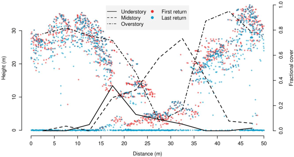 Vertical cross section of LiDAR point cloud data and derived fractional cover values for under-, mid- and overstory along an illustrative 50 m transect of 5 m width.