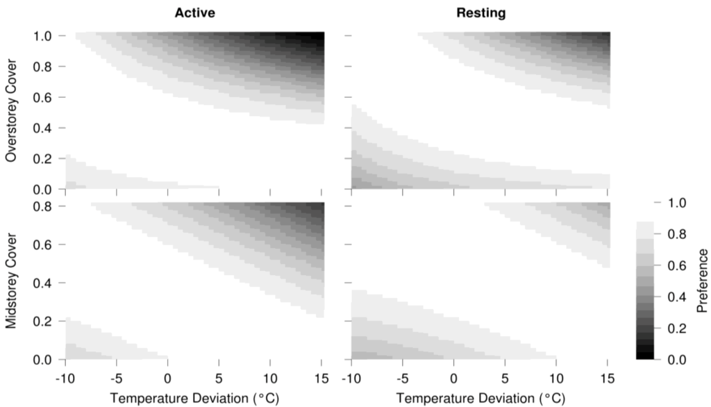 The activity status of roe deer influenced habitat selection patterns (Table 2). Generally, active roe deer selected sites characterized by lower canopy (overstory and midstory) cover and higher understory cover than sites selected for resting (Figure 3, Figure 4 and Figure 5).
