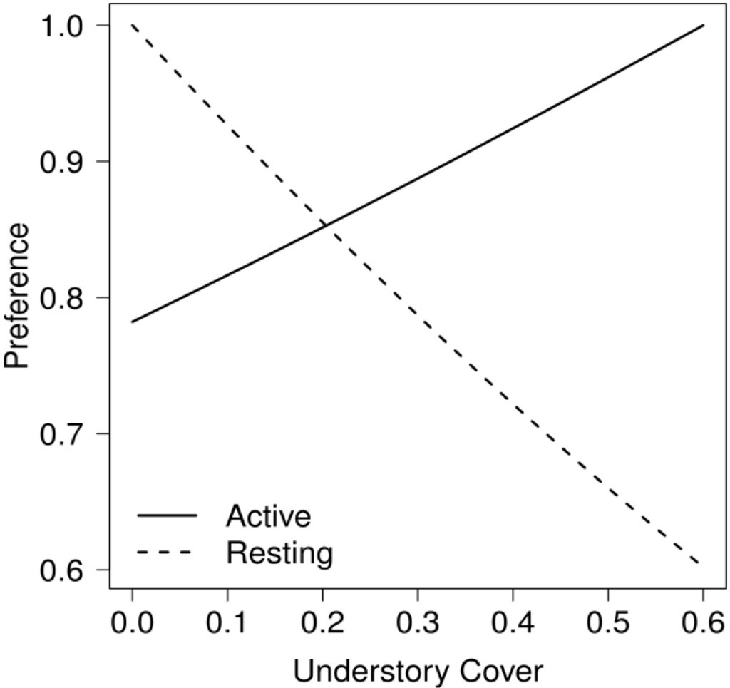 Predicted preference values for understory cover for active and resting roe deer; values represent expected values estimated by mixed conditional logistic regression; not-displayed variables were set to the corresponding data set mean.