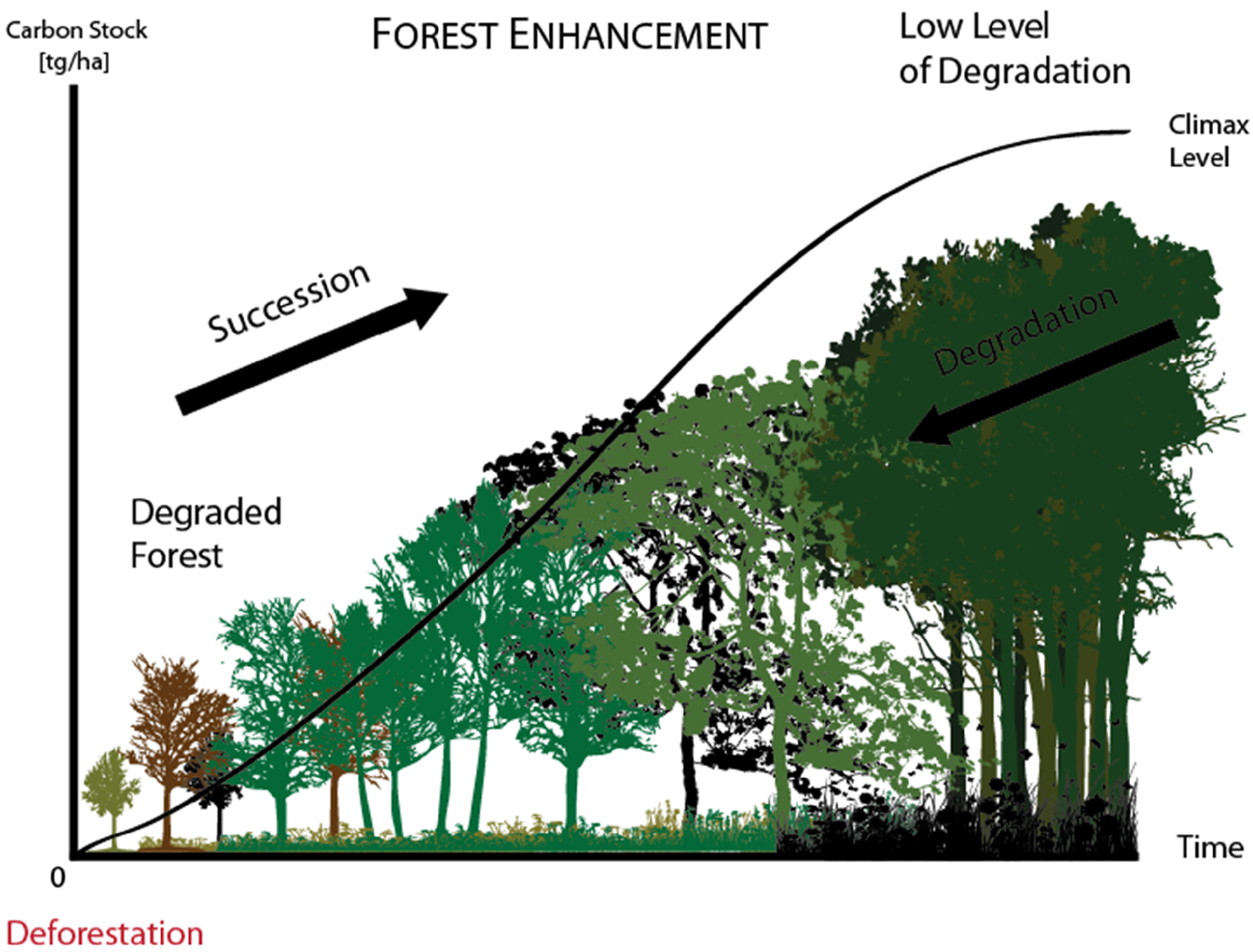 | Degraded but stable | With a low level of carbon, but small rate of losses or gains | Forest enhancement | Possibly through replanting if insufficient soil seed bank, seed rain or root stock exists for natural regeneration or sprouting. Fencing, removal of cattle. |