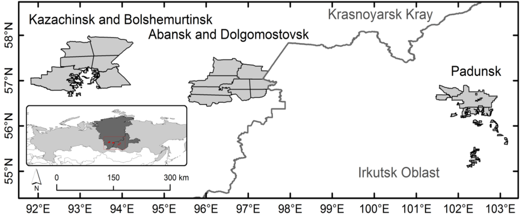 In situ data were available from three forest management areas in Central Siberia (referred to as test sites) covering an area of 2,049,629 ha (Table 1). The location and spatial distribution is shown in Figure 2. The dataset consists of a digital map of forest stands and several strata of forest variables (land cover type, species composition, tree density, average age, height, diameter, and GSV). A forest stand is defined as an elementary forest inventory unit (EFIU), a forest area relatively homogeneous in vegetation structure and growing conditions. According to the Russian forest inventory regulations [], forest stands are delineated and described by a forest inventory expert on 1:10,000 scales by using multispectral airborne images and auxiliary reference field data. The average is 17 ha with a standard deviation of 21.5 ha. The minimum size of all forest stands within the study area was four ha.